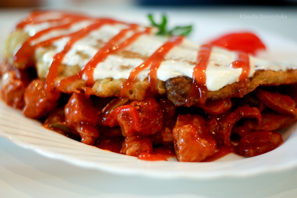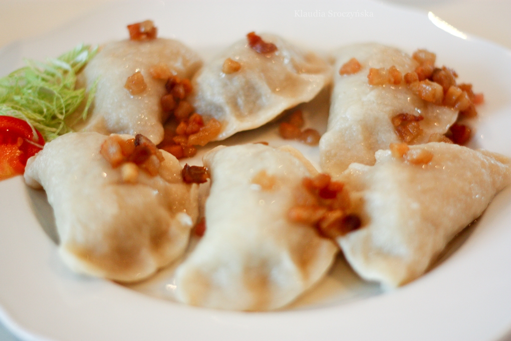 Dania główne, które wybraliśmy to placek po cygańsku (600g) w cenie 16 zł i pierogi z mięsem (6sztuk) po 9,90 zł. Placek przeraził mnie swoją wielkością, nigdy nie widzieliśmy taaakiego wielkiego placka, ale był doskonały – chrupiący i dobry placek ziemniaczany, doskonale przyrządzone mięso. Nawet Paweł nie dał rady zjeść całego, a to prawdziwy głodomor – na szczęście można wziąć danie na wynos 🙂 (albo nie zjeść wcześniej zupki). Pierogi również były przepyszne, całkiem duże, ledwo dałam radę zjeść, a mięskiem wypełnione aż po brzegi.