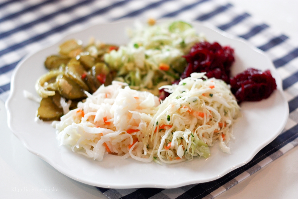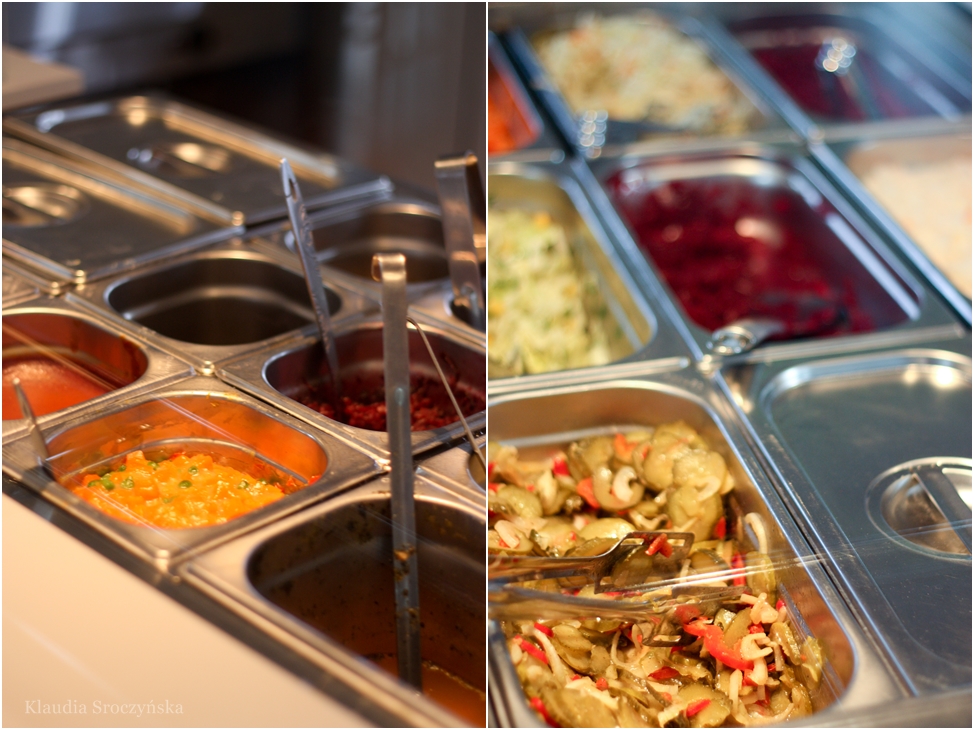 Na początku zamówiłam bukiet surówek (3 rodzaje w cenie 3,90zł) z dodatkowo wybranymi buraczkami i kiszonymi ogórkami. Wśród surówek zasmakowała mi najbardziej ta z białej rzodkwi. Każda z surówek była świeża.