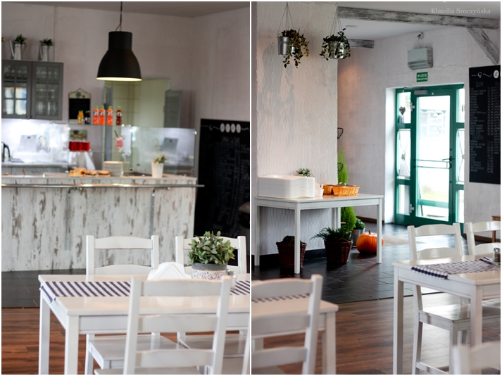 Wnętrze mnie zachwyciło, jest jasno, białe krzesła i stoliki, obrusy w kratę, drewniana podłoga i ściana z prawdziwych cegiełek, ciekawe dodatki.