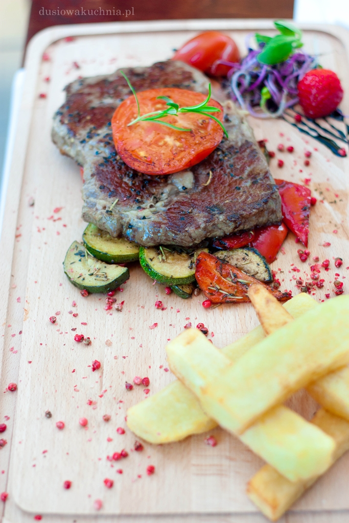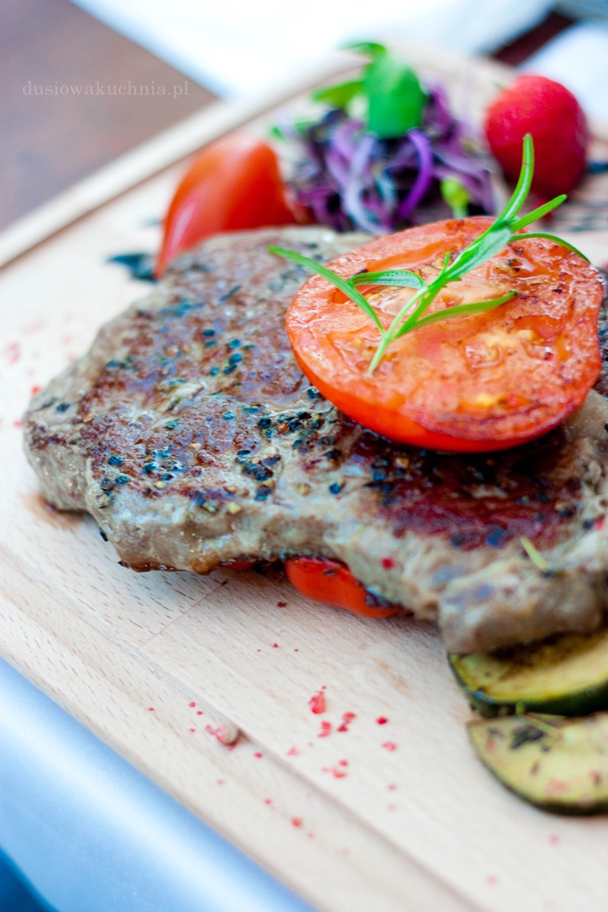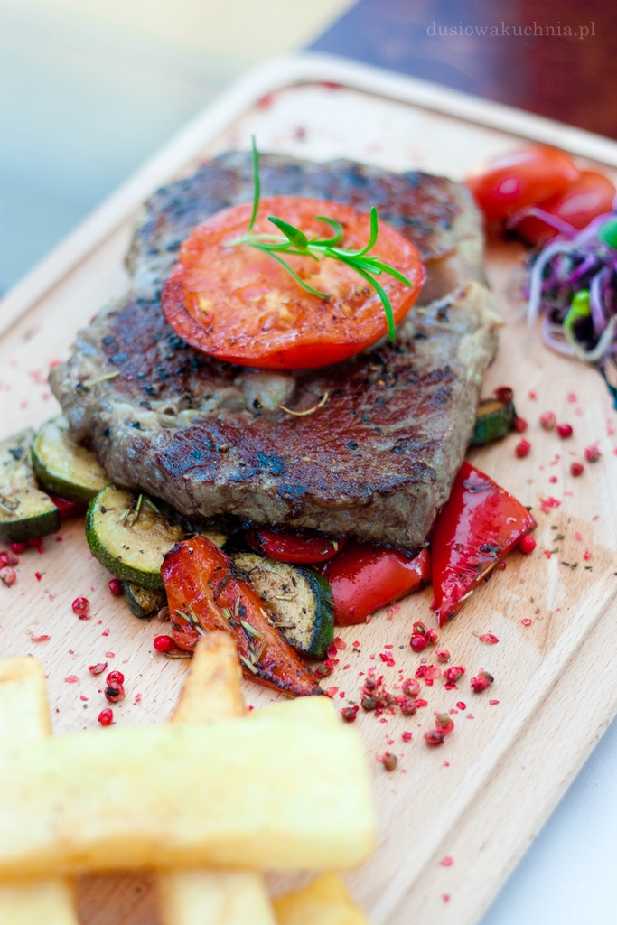 Na danie główne Paweł zamawia steka Rib-eye o wadze 320 g za 59 zł. Tego typu stek przygotowywany jest z najlepszej części antrykotu z tłustym oczkiem w środku, stąd jego nazwa. Tłuszcz stopniowo się wytapia podczas grillowania i nadaje pyszny smak mięsu. Do mięsa można wybrać dodatki, Paweł postawił na domowe frytki belgijskie i grillowane warzywa (po 5 zł za dodatki). Całość była doskonała – mięso odpowiednio wysmażone, dokładnie jak prosiliśmy, pięknie zaserwowane na desce. Co ciekawe, do niedawna nie lubiłam steków (jadłam wcześniej tylko z polędwicy), ale ten był obłędnie dobry, bo dałam się skusić na spróbowanie i nie żałuję :). Paweł również był w pełni szczęścia i rozkoszy podniebienia :).