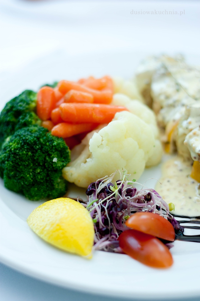 Natomiast ja tego dnia stawiam na przeciwieństwo, delikatną rybkę – roladki z soli gotowane na parze z tymiankiem doprawione francuską musztardą z sosem maślanym za jedyne 22 zł, a porcja taka solidna, że ledwo dałam radę. Bardzo duże kawałki rybki, uroczo zwinięte, przekładane cytrynką z sosem musztardowo-maślanym smakowały wybornie! Danie idealnie trafione w mój gust. Dodatki w postaci różyczek kalafiora i brokuła oraz marchewek były odpowiednio jędrne i dobrze się komponowały z rybą. Sos rewelacyjny!