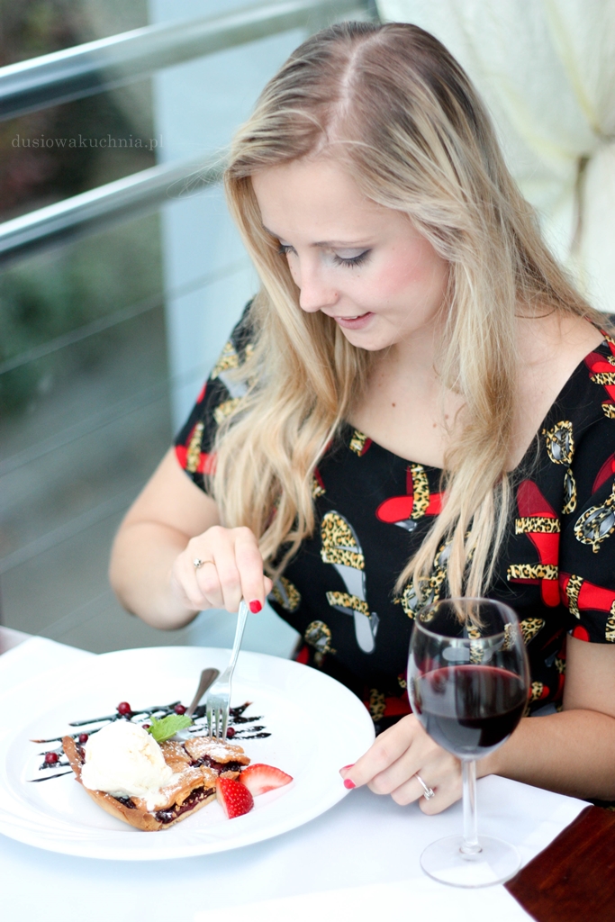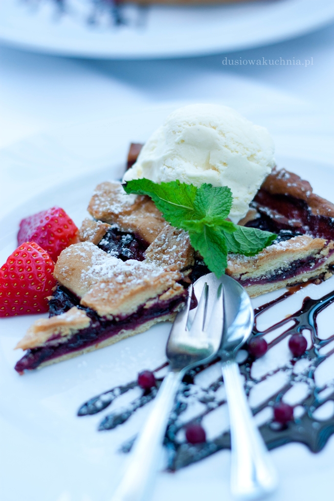 Na deser wybieramy kruchą tartę z owocami podaną z gałką lodów waniliowych za 12 zł. Ciasto idealnie kruche, ładna kratka z ciasta, wypełnione po brzegi śliwkami z nutą cynamonu. Estetyka podania dania na duży plus. Pyszne zwieńczenie romantycznej kolacji.