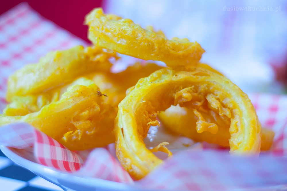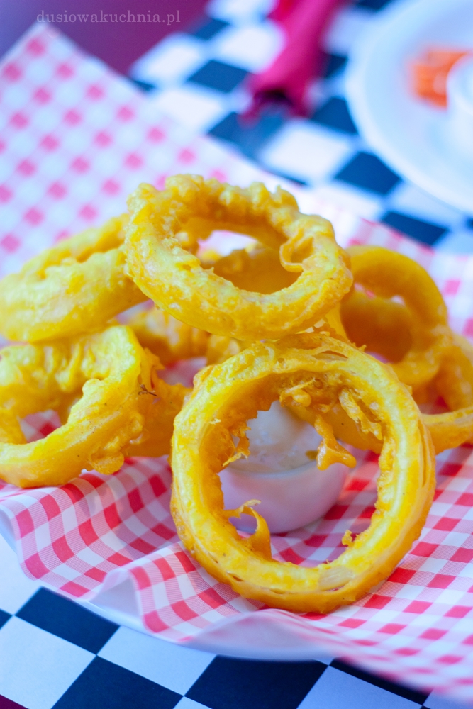 Z przystawek wybieram dla siebie krążki cebulowe za 10 zł, które podawane są z sosem pleśniowym. Otrzymuję gigantyczne krążki cienko pokrojonej cebuli w smacznym, odtłuszczonym cieście, przyjemnie chrupiące. Porcja naprawdę spora, myślę, że to świetna przekąska do spotkania przy piwie. Sos był dobry, ale nieco za gęsty przez co ciężko było nim oblepić krążki.
