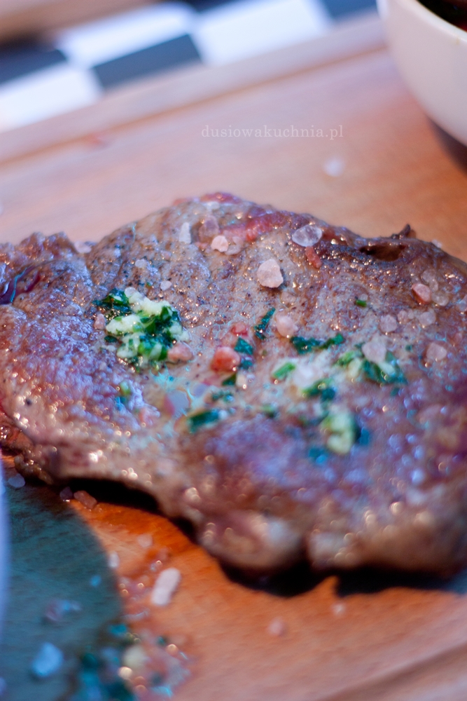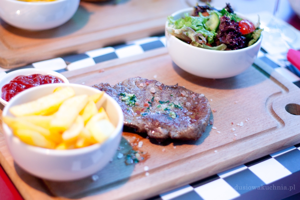 Podobno grzechem jest nie zamówić steku w amerykańskiej restauracji, dlatego na danie główne wybraliśmy stek New York Strip za 45 zł z rostbefu wołowego. Do dania można wybrać dwa dodatki u nas frytki i surówka. Oczywiście nie zabrakło pytania o stopień wysmażenia – poprosiliśmy o medium i w zasadzie prawie taki dostaliśmy, ten był trochę bardziej w kierunku rare. Mięso soczyste i smaczne, choć niepotrzebnie posypane zbyt dużą ilością soli kamiennej. Frytki nietłuste, smaczne, takie domowe.