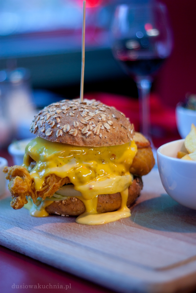 Nie mówcie, że na widok tego burgera nie leci Wam ślinka :). Obłędnie dobry, sycący, ciekawie skomponowany Kentucky burger z kurczakiem w panierce, serem cheddar, bekonem i sosem z mango (24 zł). Chrupiąca bułka i soczyste mięso to już 90% sukcesu. Burger był tak duży, że mnie pokonał – spokojnie na wielki głód :), ale uwaga to nie wszystko – do burgera podawane są frytki (lub polenta) i surówka colesław pełna majonezu, to tak gdyby ktoś jeszcze był głodny.