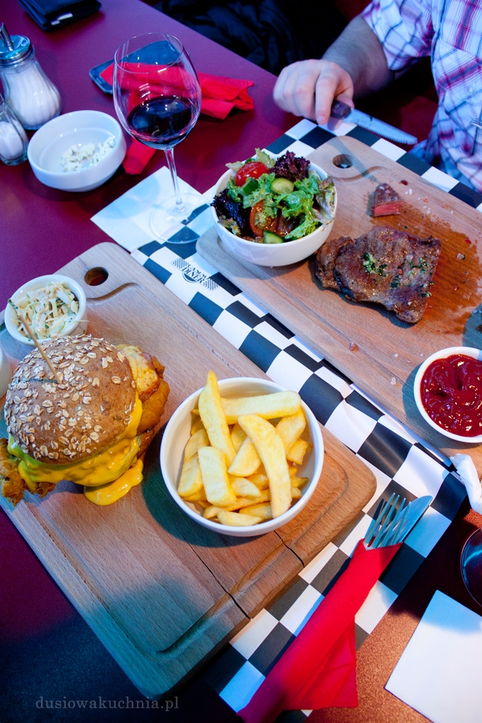 W restauracji królują steki i burgery, ale nie zabrakło innych kuchni świata – tutaj pamięta też się o wegetarianach. Menu ma pasujący design do całości. Ceny całkiem zachęcające.
