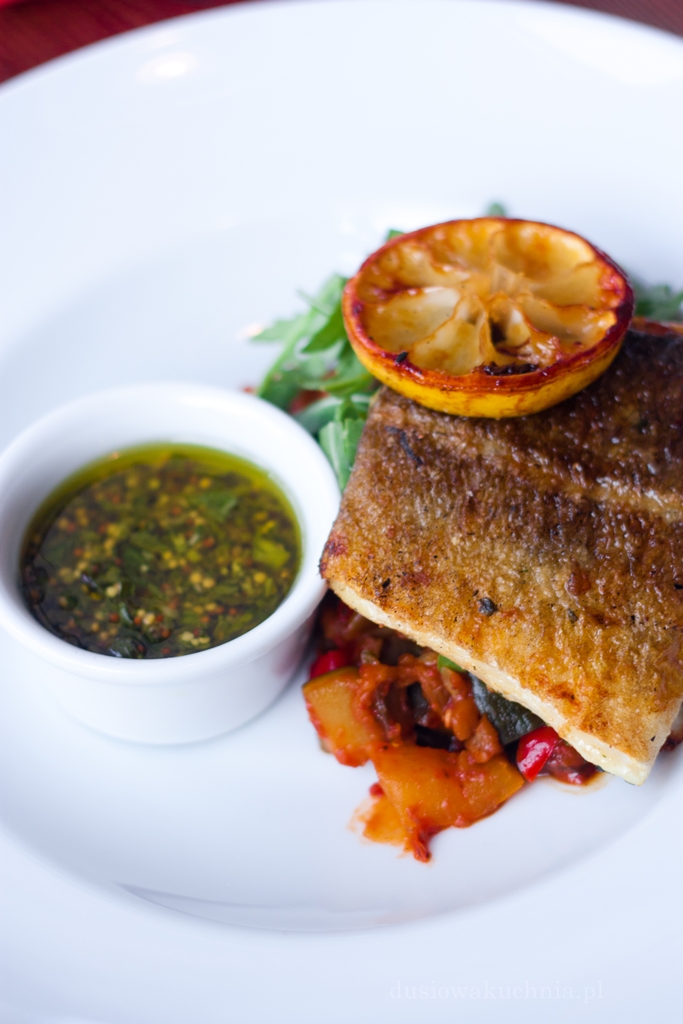 Grillowana filet z dorsza z warzywnym ratatouille i salsą verde (26 zł) – samo zdrowie. Salsa verde to sos na bazie aromatycznych ziół. Dorsz był delikatny, równie delikatnie doprawiony, co jest istotne dla osób dbających o zdrowie, a przy tym nie był przesuszony, co istotne.