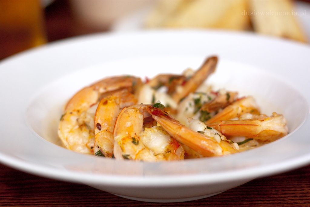 Nie mogę odpuścić spróbowania krewetek, które uwielbiam i zamawiam grillowane krewetki z kolendrą i chilli (39 zł). Krewetki były obłędnie dobre, świeże, sprężyste i chrupiące zarazem, doskonale przyrządzone – niebo w gębie! Podano do nich pieczywo z własnej piekarni.