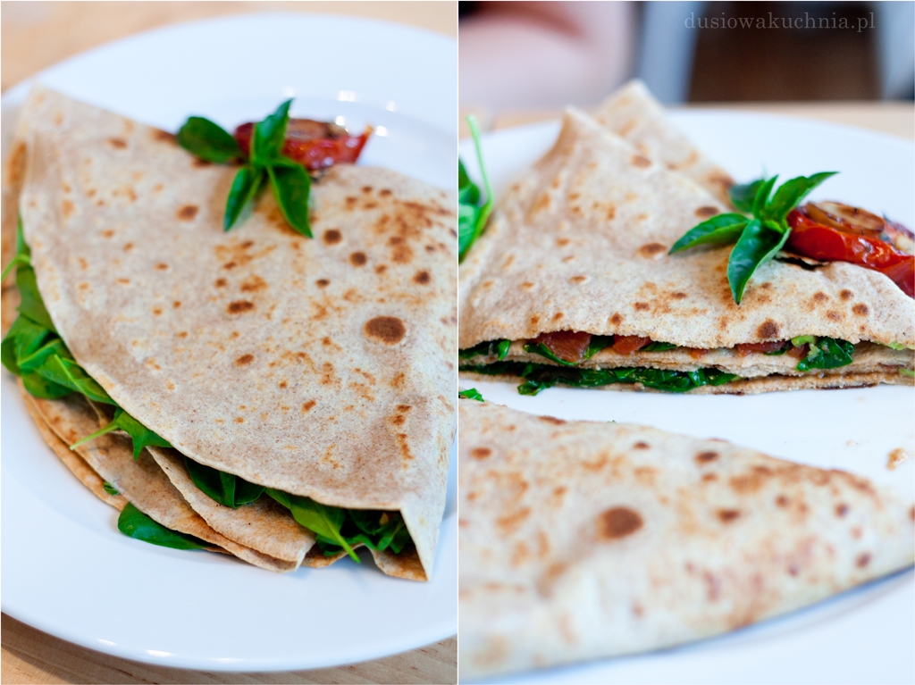 Naleśnik z mąki orkiszowej z baby szpinakiem, awokado i pistou (bazylia z czosnkiem) z pieczonych pomidorów za 14 zł. Naleśnik prezentuje się apetycznie, jest smaczny i przede wszystkim zdrowo skomponowany.