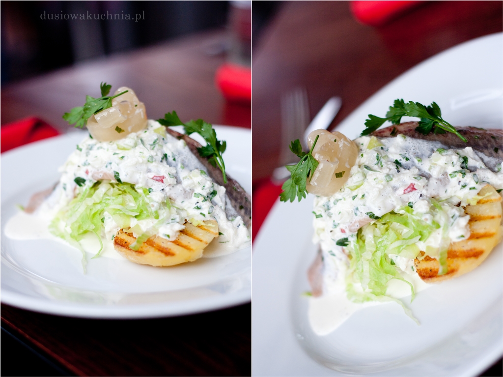W Gdyni trzeba spróbować rybki, dlatego zamawiamy też rybną przystawkę w postaci matiasa holenderskiego podanego na pieczonych ziemniakach z kwaśną śmietaną, jabłkiem i cebulą (14 zł).