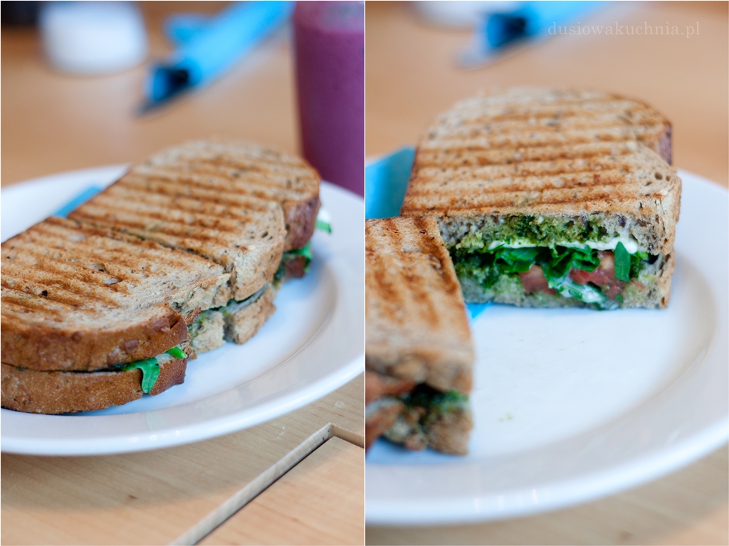 Próbujemy też doskonałe przygotowane panini z wegetariańskim farszem z pesto, pomidorem, rukolą i mozzarellą (12 zł).