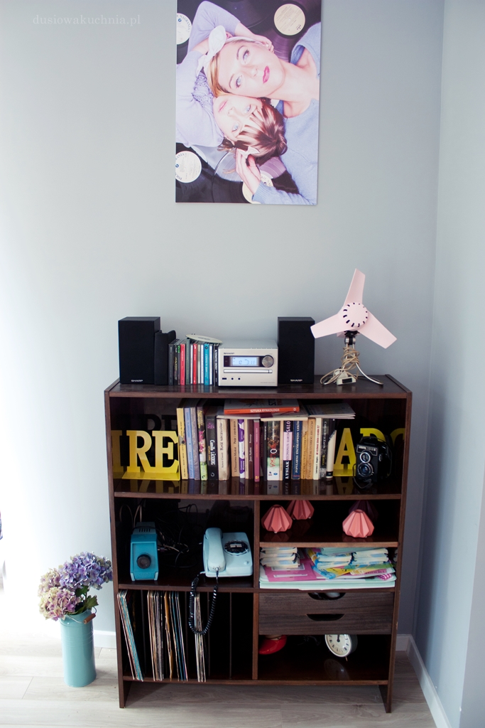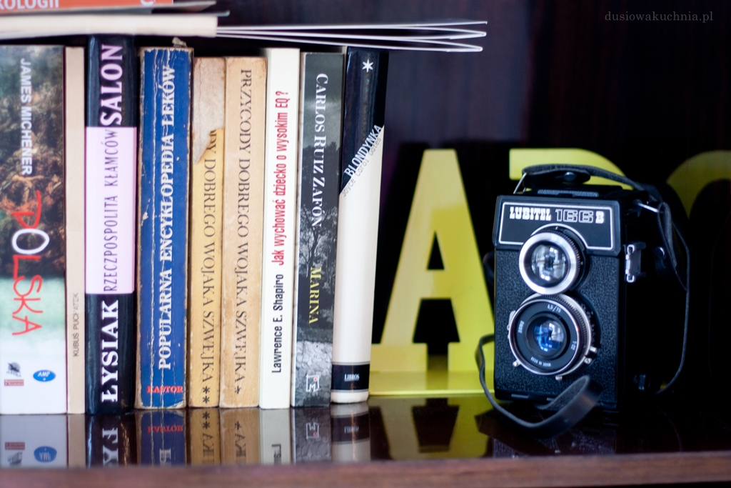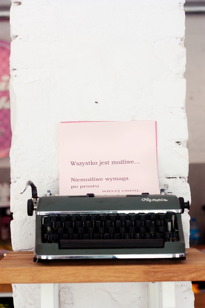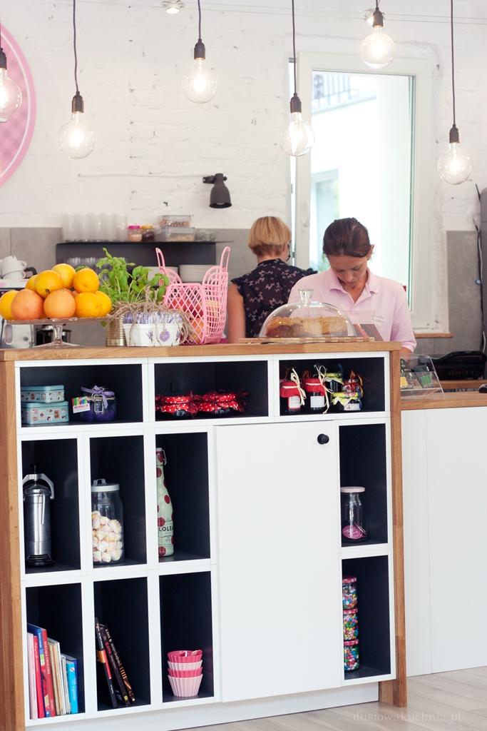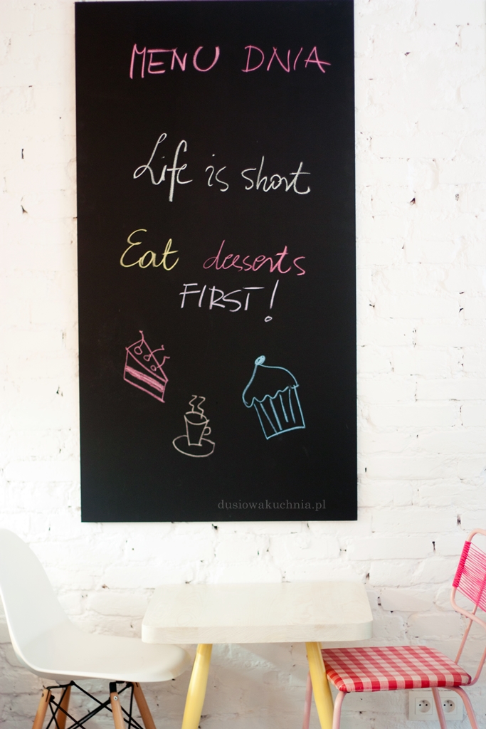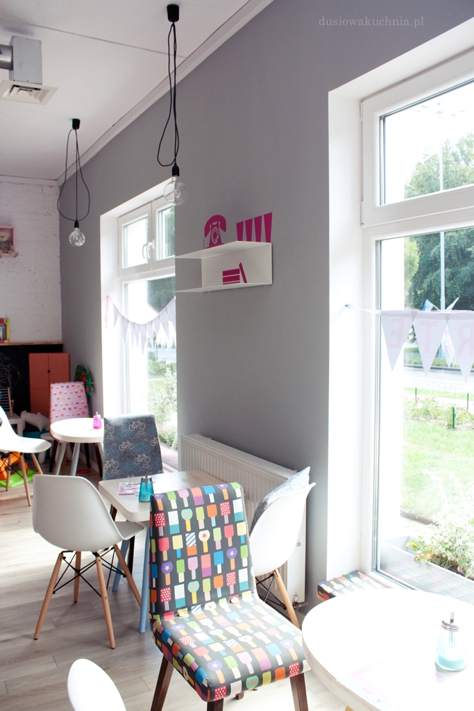 Wnętrze urządzono naprawdę przytulnie, w stylu retro, który tak bardzo lubię. Podbielone stare cegły nadają lokalowi klimatu. Znajdziemy tu wygodne krzesła dopasowane do wzrostu dzieci, z ciekawymi obiciami, poduszki na parapetach, mnóstwo retro gadżetów, książki do poczytania i wypisane pozytywne sentencje. W tle leci spokojna muzyka. Lokal zaprojektowano dbając o najmniejsze szczegóły. Dla maluszków są specjalne krzesełka, a w łazience nie zabrakło przewijaka z chusteczkami nawilżającymi.