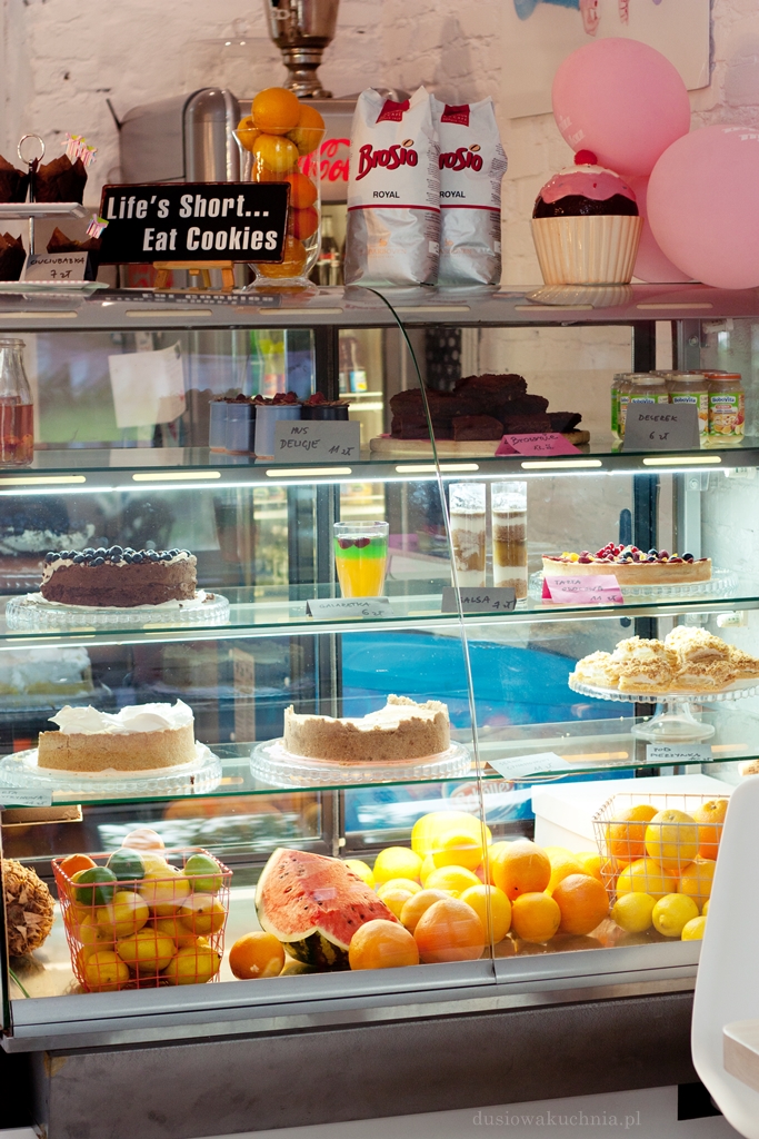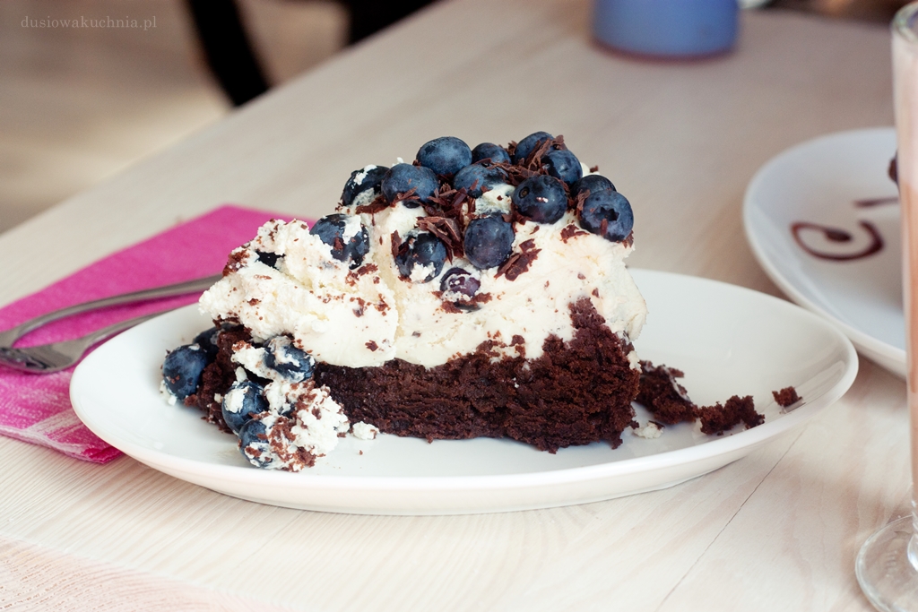 Przetestowałam ze słodkości mus czekoladowy z malinami o nazwie „Delicje” – obłędnie pyszny, mocno czekoladowy i słodki w cenie 11 zł oraz doskonałe ciasto bezglutenowe czekoladowe z mascarpone i borówkami, które rozpływało się w ustach (12zł).