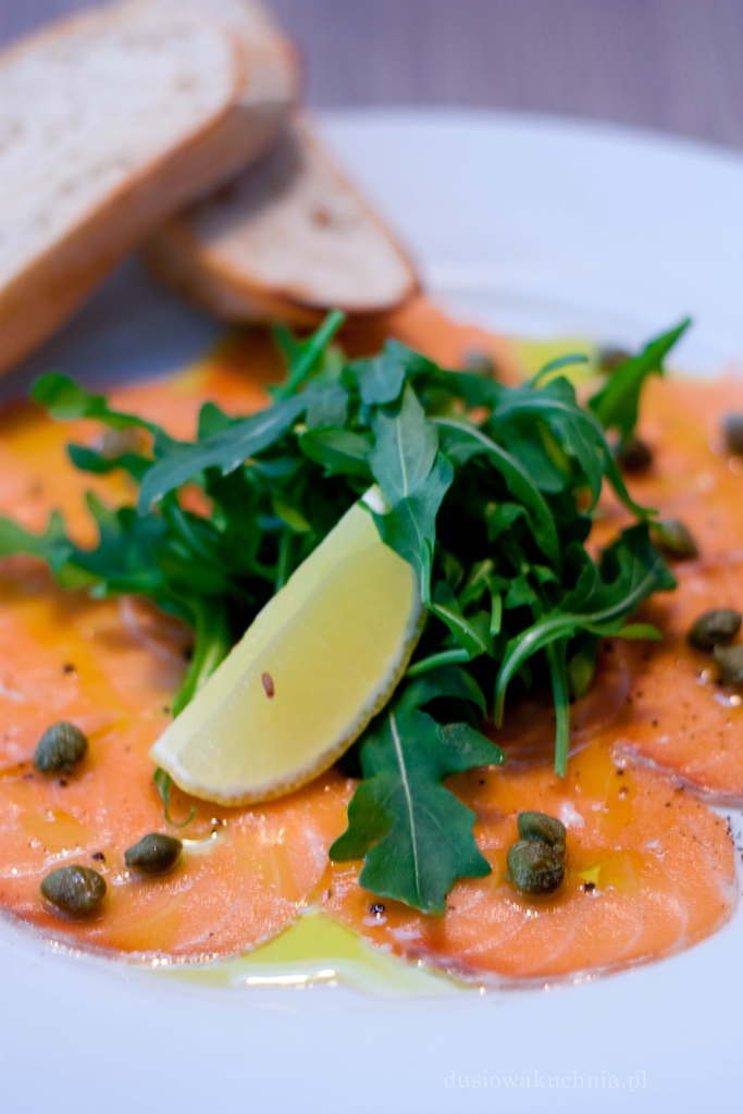 Na przystawkę wybieram carpaccio di salmone, z idealnie cienkimi plastrami łososia podanego z kaparami, rukolą, cytryną do skropienia, oliwą oraz dobrej jakości pieczywem (26zł). Bardzo przyjemna przystawka.