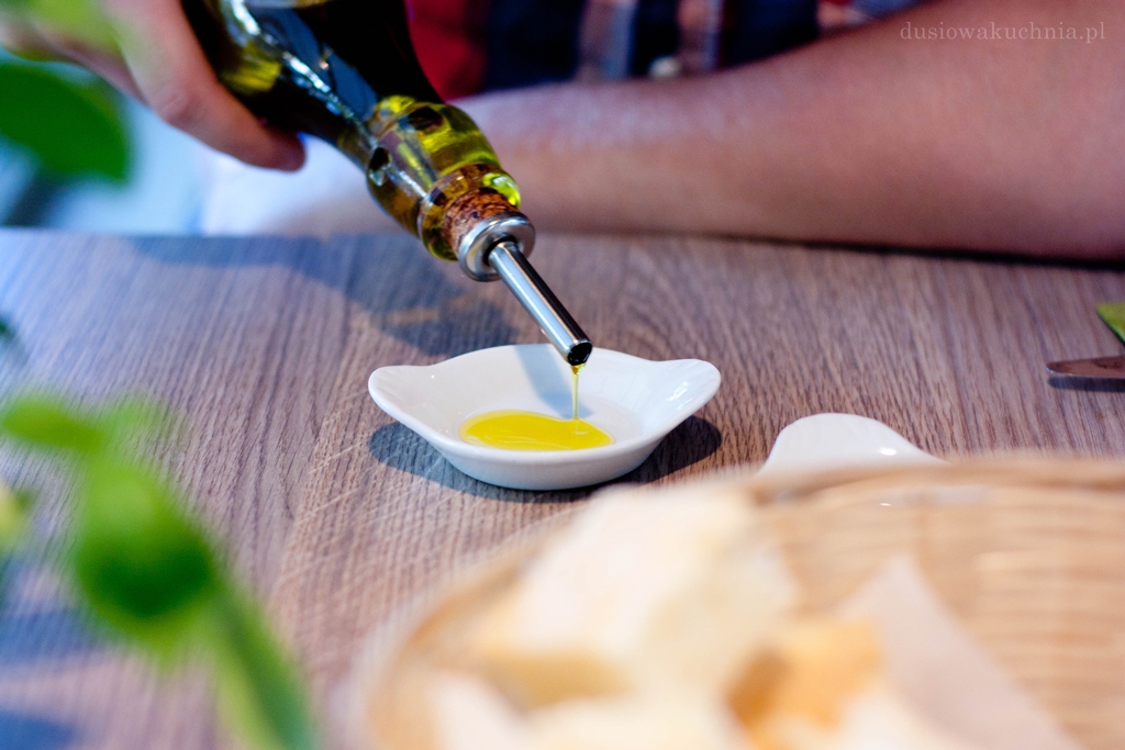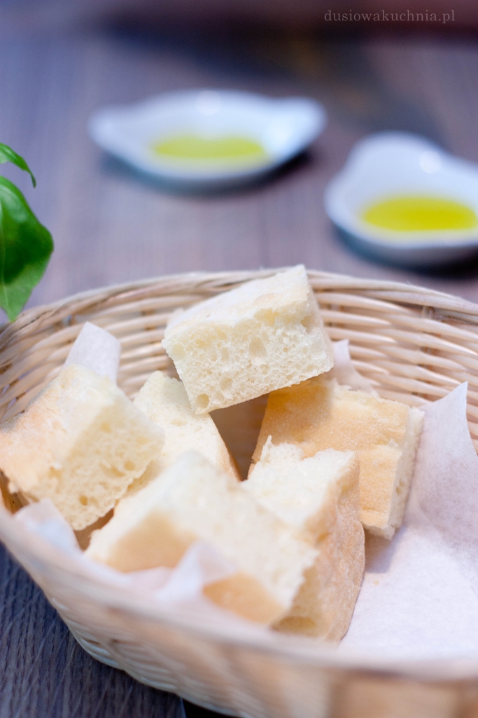 Chwilę po złożeniu zamówieniu na naszym stole ląduje starter w postaci wypiekanej na miejscu focacci, którą podjadamy razem z oliwą. Starter lekko zaspokaja nasz głód, ale jednocześnie pieczywko jest tak dobre, że nie możemy doczekać się aż na stole wylądują przystawki.