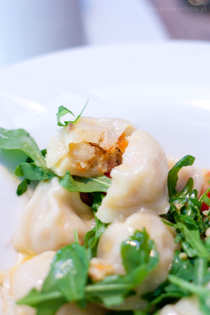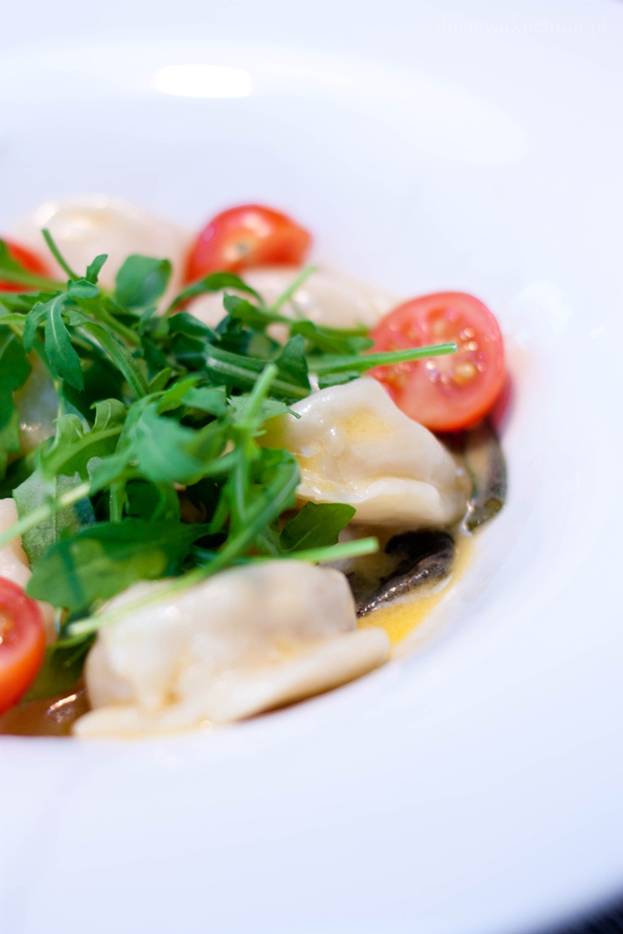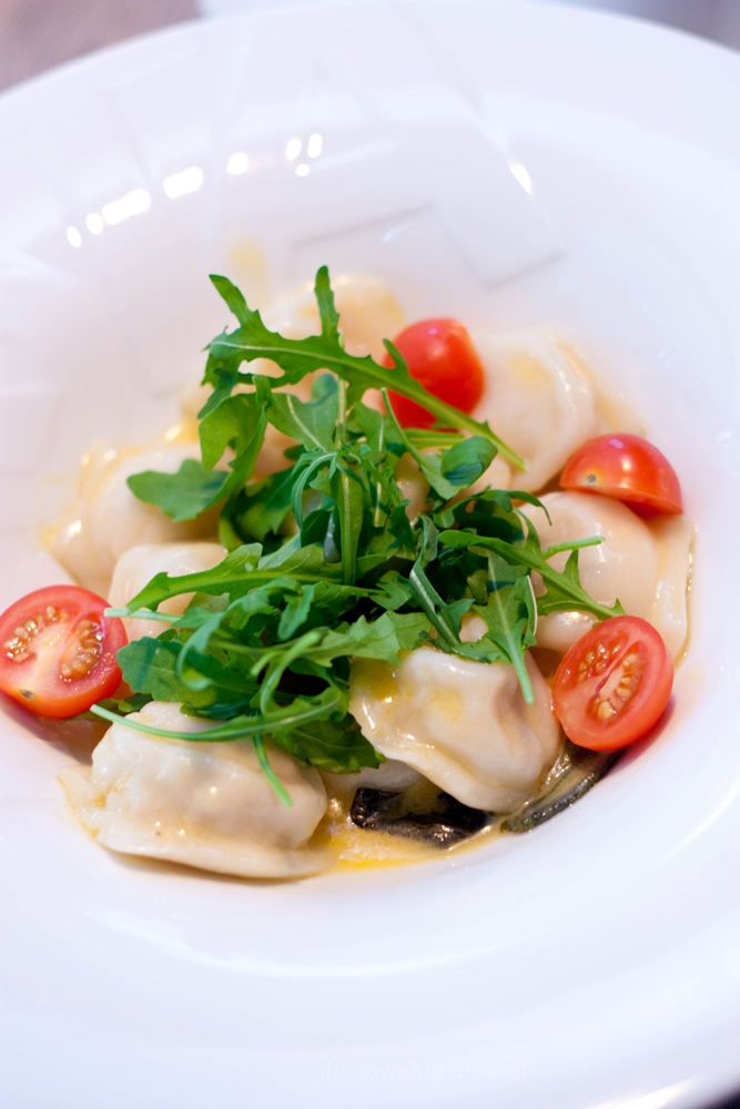 Przejdźmy do mojego dania głównego – ja decyduję się na pierożki ravioli faszerowane krewetkami, szyjkami rakowymi, bekonem, marchewką i ricottą podane z kwaskowatym sosem cytrynowo-maślanym (36zł). Porcja może się wydawać mała, ale zapewniam, że taka nie była, ponieważ pierożki okazały się syte, nafaszerowane w pełni owocami morza (ah te afrodyzjaki!). Sos idealnie komponował się z pierożkami i dopełniał danie. Ciasto na pierożki było delikatne i miękkie – pyszne!.