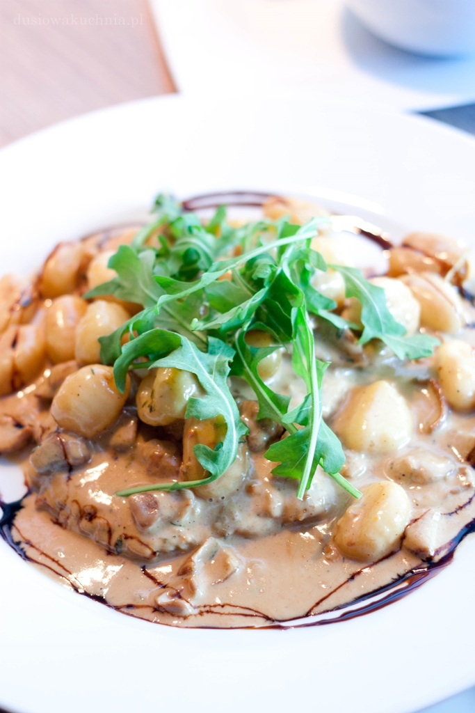 Moja Połówka zamawia na danie główne gnocchi w sosie borowikowym – pyszne kluseczki smakują wybornie z gęstym, bardzo aromatycznym sosem grzybowym z nutą balsamico. Do tego dania podawana jest sałatka z sosem winegret – chrupiąca sałatka, słodkie pomidorki ze słonecznikiem, a winegret może trochę za gęsty, ale w smaku nam odpowiadał, słodko-kwaśny, mocno ziołowy. Paweł trochę marudził, że za dużo tej zieleniny, bo jeszcze rukola była podana na gnocchi niepotrzebnie, ale tym sposobem ja zjadłam sałatkę :).