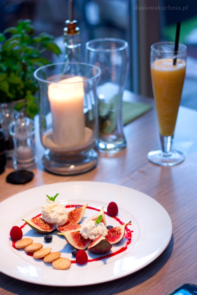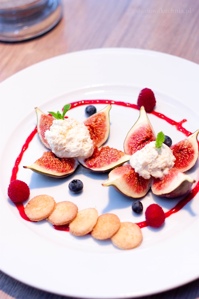 W temacie deserów pozostaję tylko ja, bo oczywiście, jako kobieta nie mogę przeboleć tego, że nie spróbowałabym czegoś słodkiego i w tym miejscu decyduję się na wybór deseru z karty dnia. W dzień naszej wizyty dostępny był figowy deser, a dokładniej figi pieczone z miodem podane z orzechowym mascarpone i kruchym ciastkiem za 12 zł (czy muszę mówić, że figi to też afrodyzjak? 🙂 ). Smak dania? rozkosz dla podniebienia, coś pysznego, po prostu rozpływało się w ustach. Forma podania również zasługuje na uznanie.