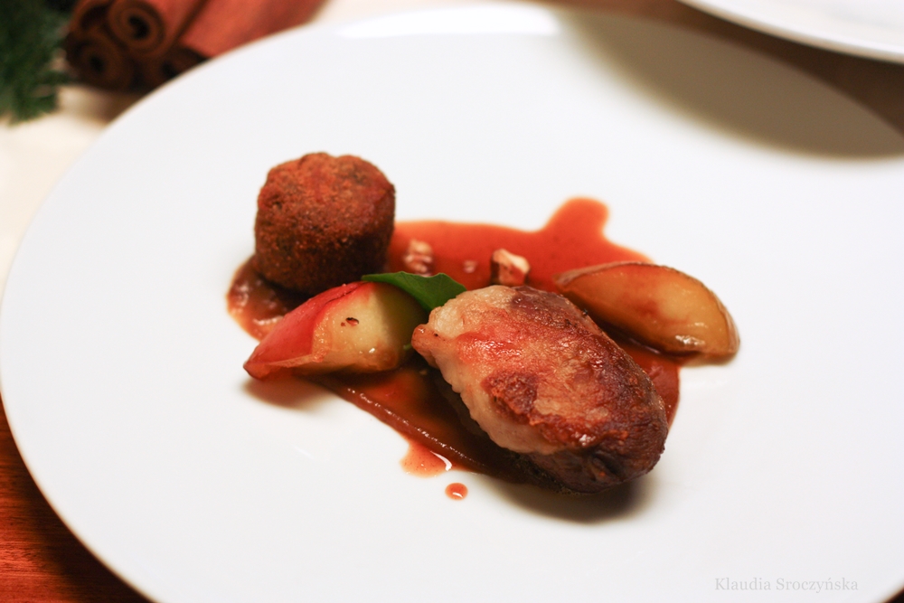 Sporo kontrowersji wywołał policzek wieprzowy confit podawany z purre z karmelizowanej cebuli, miodowo-rozmarynowymi jabłkami oraz jabłkowym sosem. Danie podano z magiczną kuleczką – co to takiego, musicie sprawdzić sami 🙂 Nie jestem wielką fanką mięsa, ale policzek rozpływał się w ustach, był doskonały, a jabłka nadały daniu jesienny i taki domowy charakter. Niektórzy nie byli w stanie przełknąć więcej niż jeden kęs, dlatego dla nich podano falafel z ciecierzycy podawany z bakłażanowym chutney’em i mini sałatką.