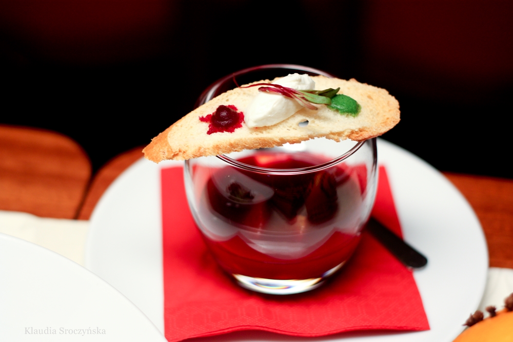 Pierwsze danie, które skosztowałyśmy to zupa z pieczonych buraków aromatyzowana pomarańczą oraz korzennymi przyprawami serwowana na zimno z piklowana dynią – niezwykle ciekawe połączenie buraków z pomarańczą w postaci musu, podane z grzanką z pesto i kozim serem.