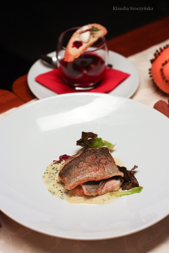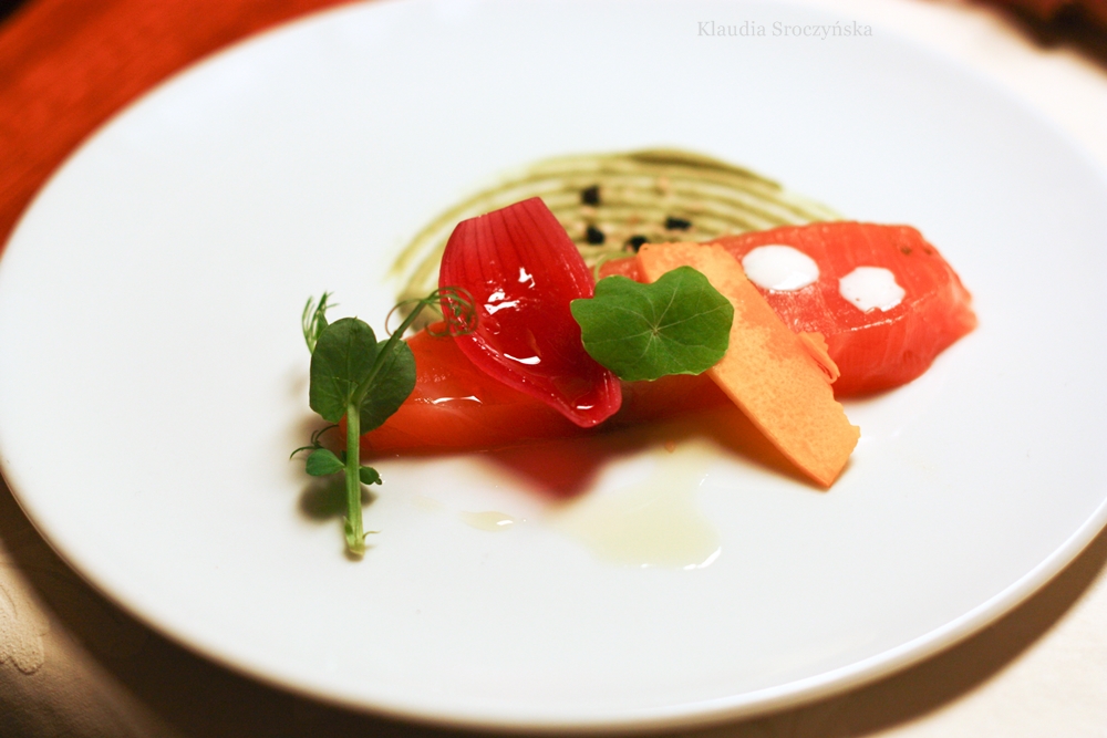 Zaskoczeniem, jeśli chodzi o formę podania, okazał się marynowany łosoś gravlax, serwowany z piklowaną dynią, purre z avocado, marynowaną czerwoną cebulą i mikro ziołami – łosoś powinien być troszkę dłużej marynowany, ale i tak był smaczny, cebulka świetnie podkręciła jego smak, a mikro zioła dodały uroku – moja dusza biologa była zachwycona 🙂