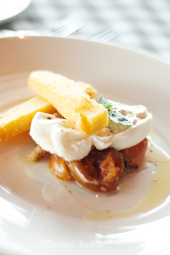 2. Burrata – kremowa mozzarella podana z frytkami z polenty i trufli, z dressingiem ze świeżych pomidorów.