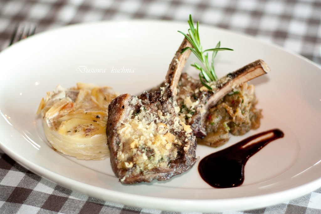 5. Kotlety jagnięce podane z puree z wędzonego bakłażanu i tartą z karczochów i ziemniaków.