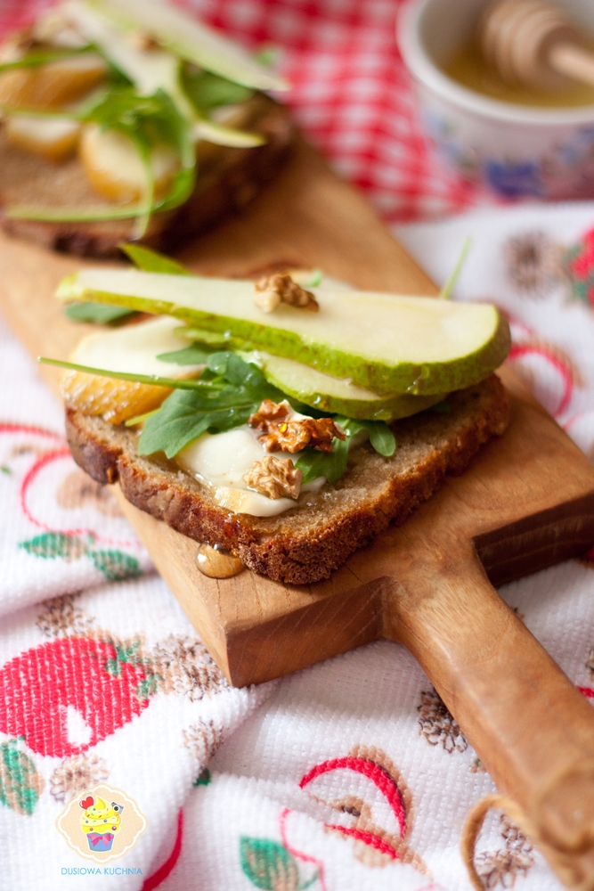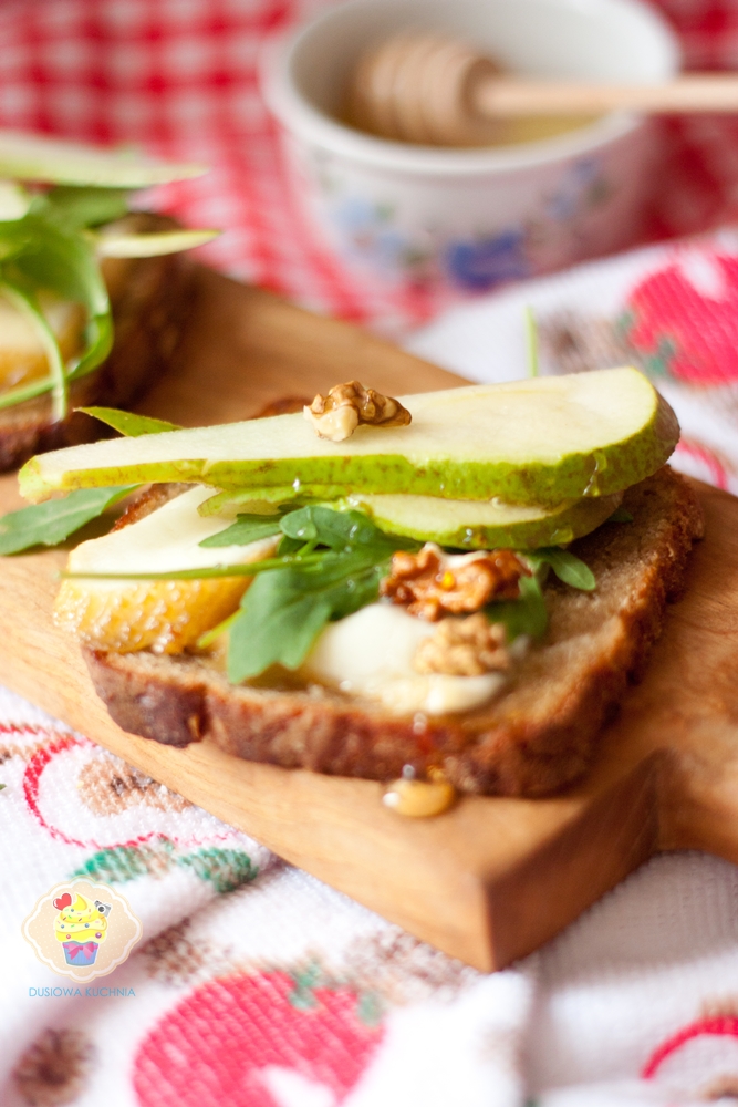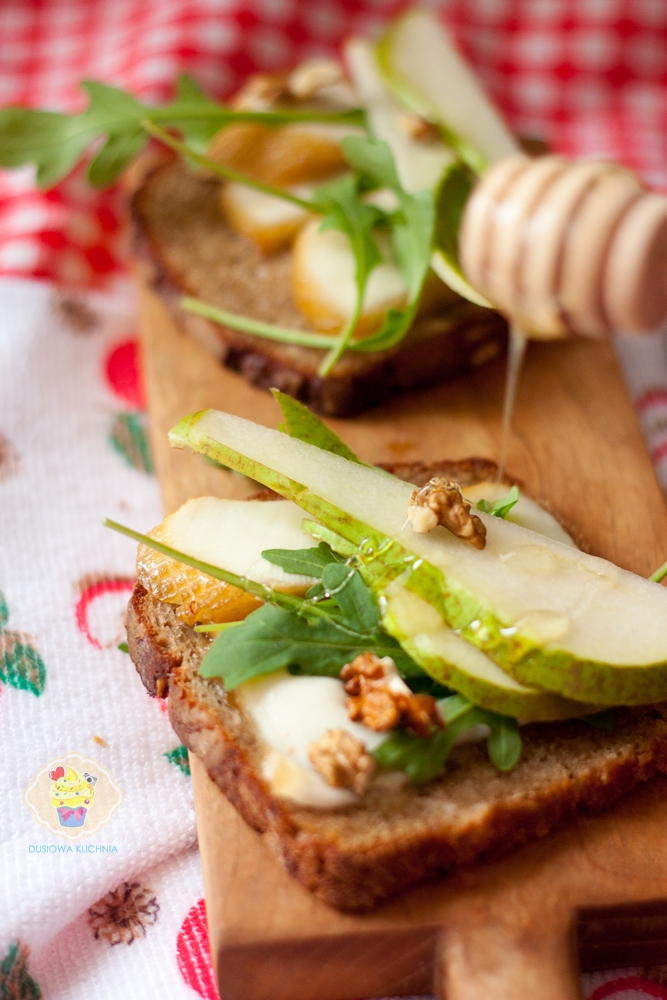 Zapiekać chwilę, po czym zdjąć ułożyć na wierzchu jeszcze rukolę, kawałki gruszki, orzechy.