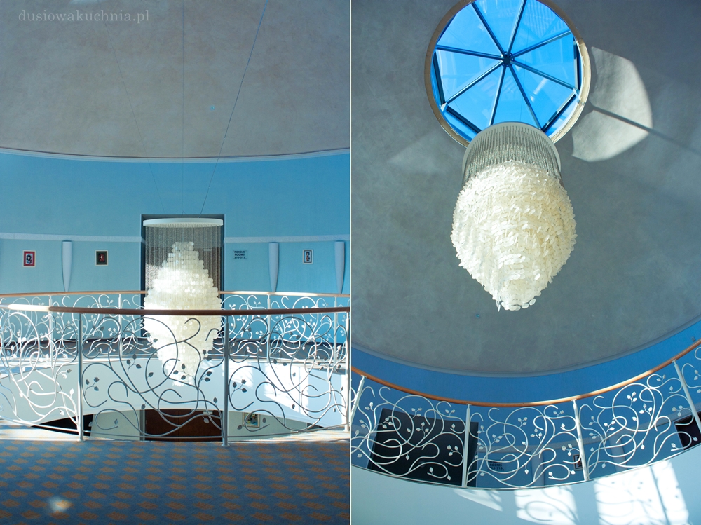 Wnętrze dworku jest naprawdę stylowe i dopracowane w najmniejszych szczegółach. Niebiesko-miętowe wnętrze, kobaltowy kaflowy piec, kwieciste obrazy, lampa z masy perłowej i światło wpadające przez oszkloną kopułę tworzą niesamowity klimat.