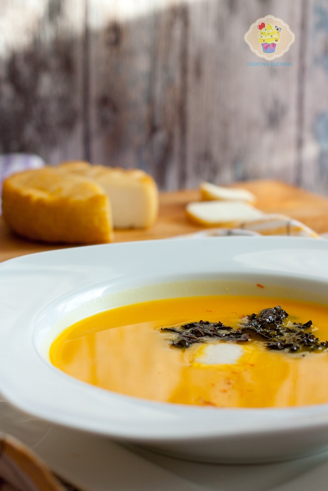 Krem z dyni z chipsem z jarmużu i kozim serem