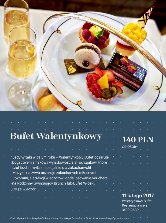 – bufet walentynkowy w restauracji Wave za 140 zł/osoby (klik), pełne bogactwo smaków i kolorów, mnóstwo afrodyzjaków, wino w cenie, muzyka na żywo (to najlepsza oferta na rynku trójmiejskim, 20 przystawek, 10 dań głównych, 11 deserów – aż ślinka leci).