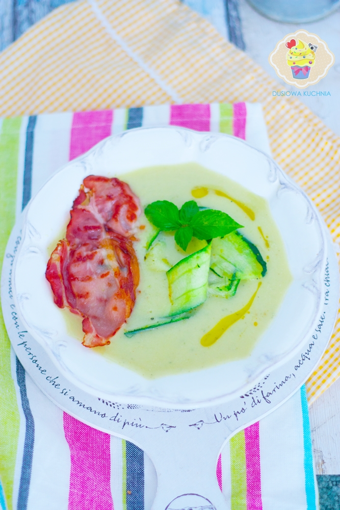 Na wierzch zupy dodać kilka cienkich plastrów cukinii (zrobionych obieraczką) i chwilę je podgotować by zmiękły, a następnie wyjąć i odłożyć.