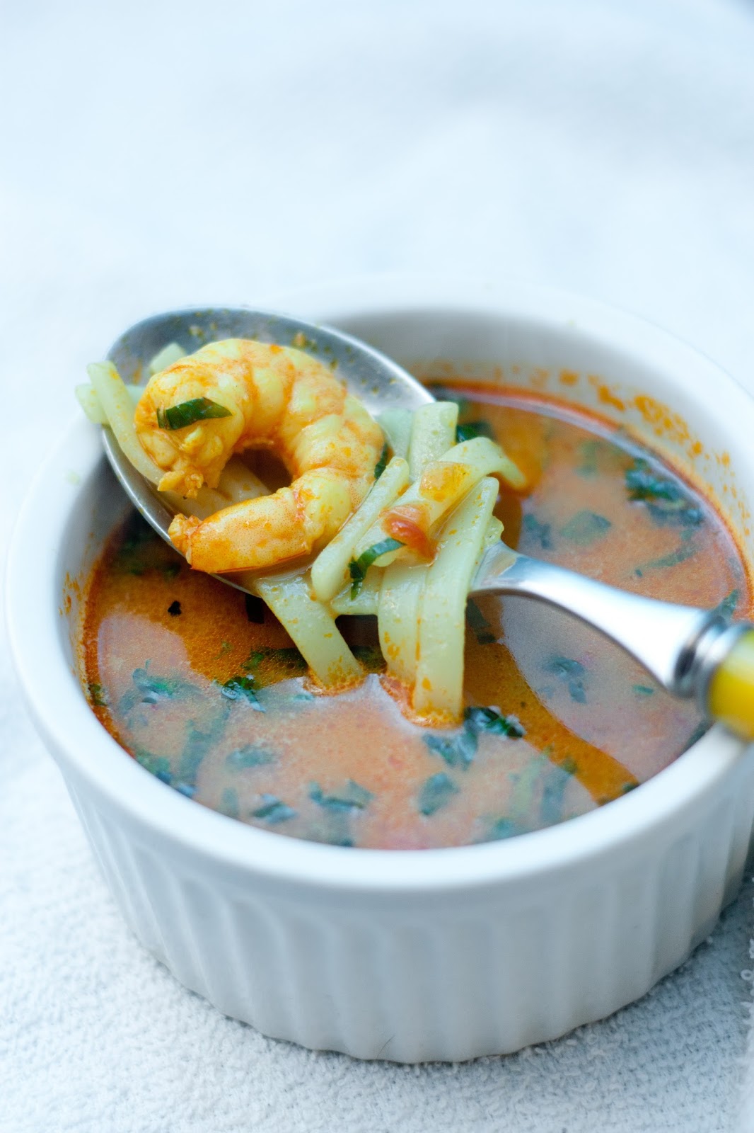 Zupa tajska/ mleko kokosowe/ pasta curry/ trawa cytrynowa/ makaron (czysta 11 zł, z krewetkami lub kurczakiem 14 zł) – to najlepsza tajska w całym Trójmieście, nie boję się tego powiedzieć! W dodatku w jakże atrakcyjnej cenie. Szef Mariusz pracował z Tajami, posiada więc wiedzę w zakresie kuchni tajskiej, ale sam opracował idealny przepis na tą najbardziej znaną tajską zupę. W zupie dominował aromat kokosowy z wyraźnymi cytrusowymi nutami, które pochodziły od trawy cytrynowej, imbiru, kolendry i liści kaffir, całość była dosyć mocno pikantna. Naszą zupę jedliśmy z krewetkami, które były naprawdę świeże, bo soczyście chrupały. Aromatyczna, pikantna i pyszna! Koniecznie sprawdźcie, czy faktycznie jest najlepsze :).