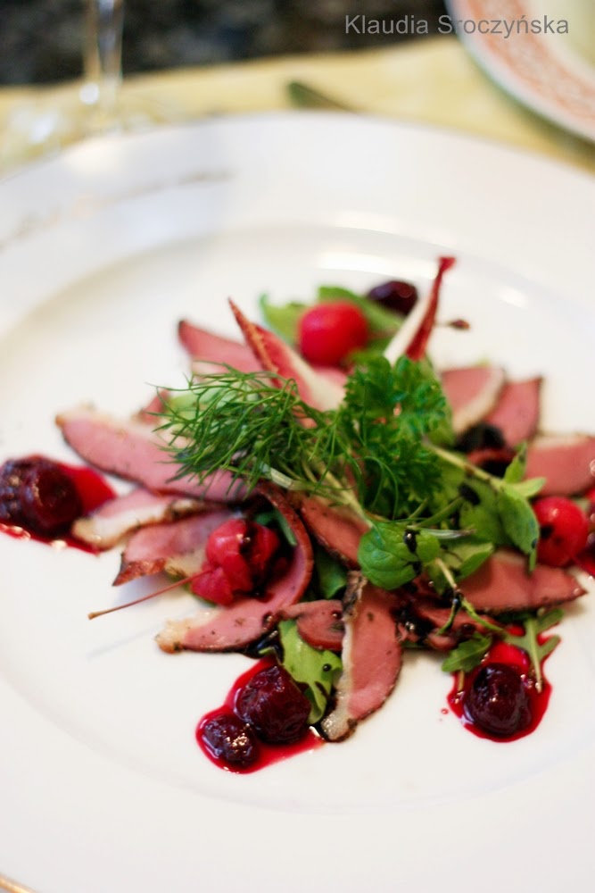 Paweł delektował się piersią kaczą wędzoną zimnym dymem z wiśniami marynowanymi martelem (koniakiem) za 25 zł. Nie byłabym sobą, gdybym nie spróbowała, pierś była idealna, nie sucha i nie za mocno uwędzona, z dodatkiem kremu balsamicznego, a wiśnie w koniaku idealnie współgrały z mięsem. Na uwagę zasługuje bardzo ładna forma podania dania.