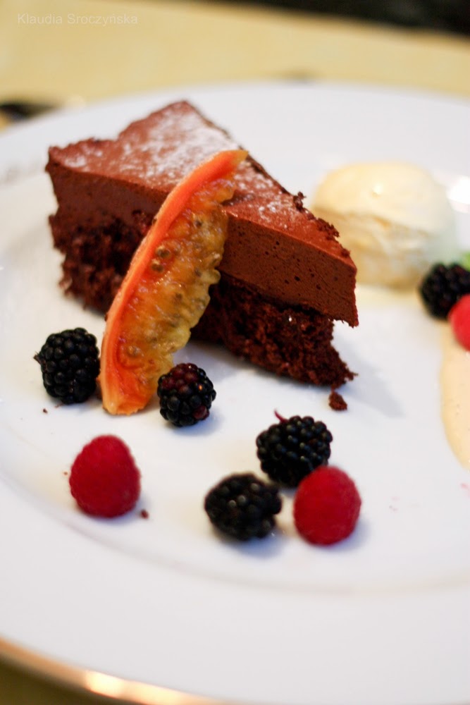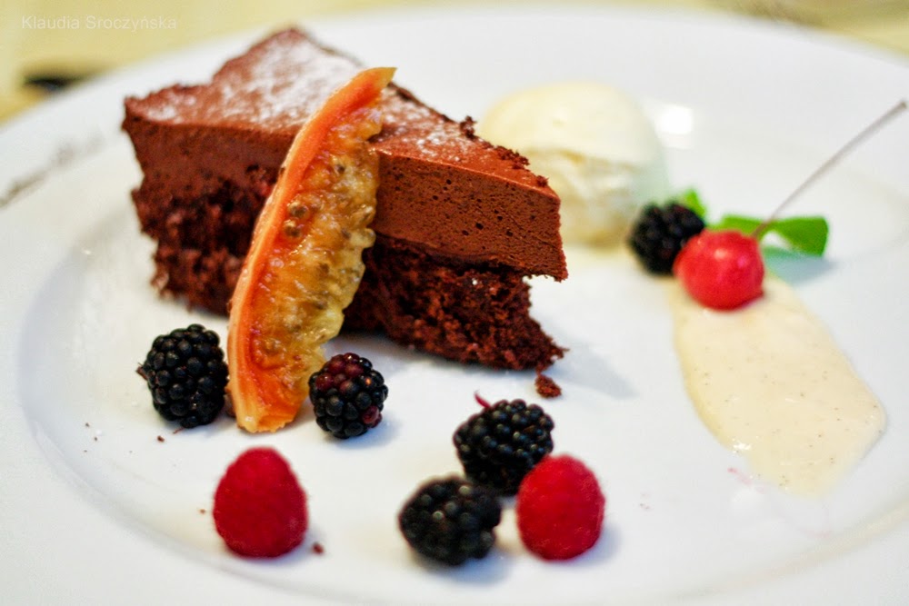 Nasze brzuszki były już naprawdę pełne, ale nie mogliśmy się powstrzymać przed spróbowaniem jakiegoś deseru, po tak pysznych daniach i deser nas ciekawił. Za namową Szefa Kuchni – Janusza Małyszko zamówiliśmy ciasto czekoladowe bez mąki z waniliowym sosem i lodami. To był strzał w dziesiątkę i idealne uwieńczenie tej cudownej uczty. Ciasto było rewelacyjne, mocno czekoladowe, wilgotne, przepięknie pachniało, a przy tym wszystkim składało się z dwóch warstw, pierwsza składała się z pieczonego ciasta jakby brownie, a drugą był rozpływający się w ustach mus czekoladowy. Owoce na talerzu idealnie przełamywały swoją kwaskowatością słodycz ciasta, które wcale nie było za słodkie, po prosto lekkie, jak chmurka,a pyszne tak, że można odlecieć 🙂