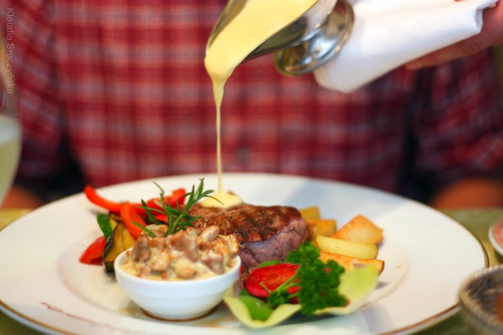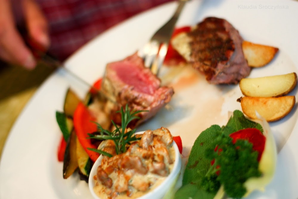 Pavcio, jak prawdziwy mężczyzna postawił na mięso i wybór padł na chautebriand w sosie bernes (90zł). Chatebriand to francuskie danie i rodzaj grubego befsztyku, który wykrajany jest ze środkowej części polędwicy wołowej (stąd też jego wysoka cena) , następnie obsmażany delikatnie z dwóch stron i podawany z sosem bearneńskim (powstały na bazie sosu holenderskiego z dodatkiem estragonu). Do dania podane były przepyszne kurki w sosie, grillowane warzywa i opiekane ziemniaczki. Najlepszym dowodem na to, że danie było genialne jest fakt, że samego befsztyku spróbowałam ja – zarzekałam się, że nie zjem ponownie krwistego mięsa, po przygodzie z jagnięciną, która mnie nie przekonała – i…smakowało! To był szok dla mnie samej 🙂