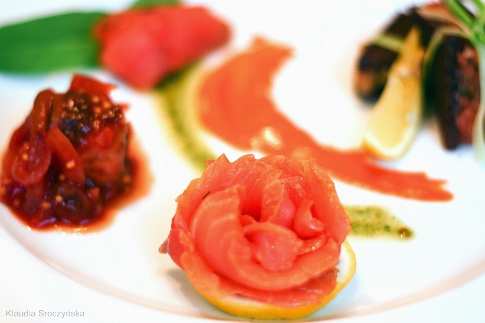 W menu główne miejsce zajmują ryby, oczywiście z łososiem na czele, a także mięsa, jednakże nie zapomniano o wegetarianach. Na przystawkę wybrałam sobie talerz specjałów z łososia w cenie 35 zł. Na talerzu znalazły się różne warianty łososia, mi przypadł w szczególności marynowany chyba w jakimś pomidorowym sosie z cebulką, gorczycą, coś a la nasze kaszubskie śledzie, oraz drobno posiekany podany w pakieciku z pumperniklem. Różyczka łososiowa mnie urzekła 🙂