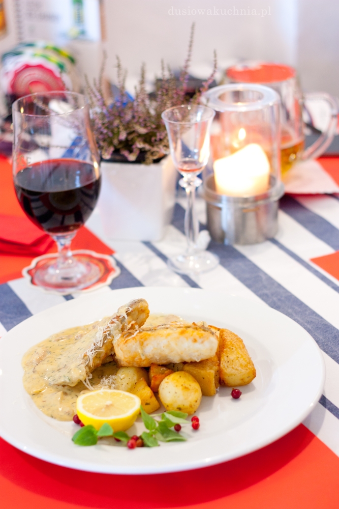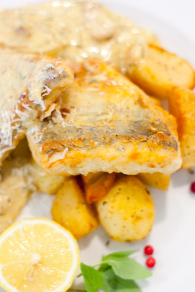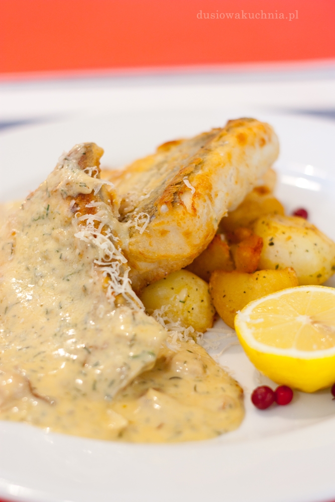Natomiast ja wybrałam sandacza w sosie borowikowym (byłam przekona, że sos będzie tak samo dobry, jak zupa i się nie myliłam) w cenie 29 zł. Na talerzu dostałam dwa spore kawałki ryby w panierce, posypane serem i podane z opiekanymi ziemniaczkami (można wybrać formę podania ziemniaków). Ryba była soczysta i rozpływała się w ustach. Panierka była trochę za twarda i to mi przeszkadzało, ale mięso ryby było naprawdę rewelacyjne. Nie ukrywam, że porcja duża nawet na mój żołądek.
