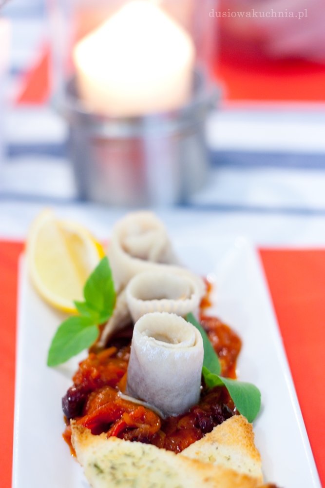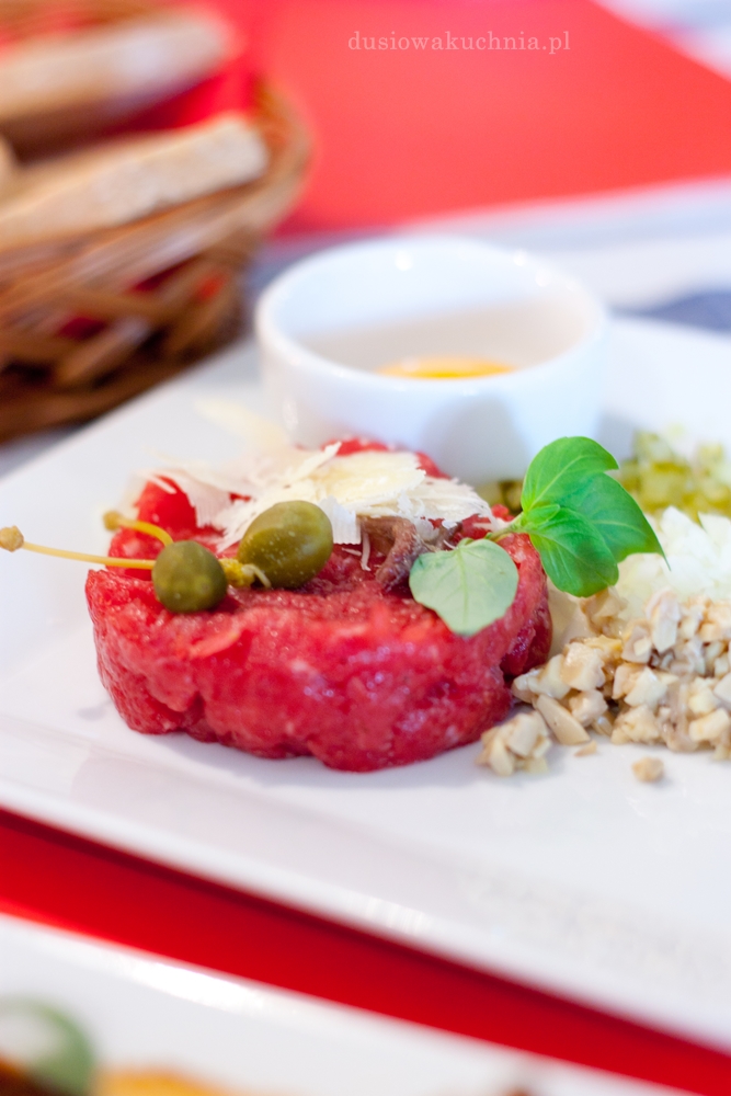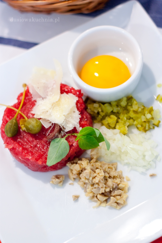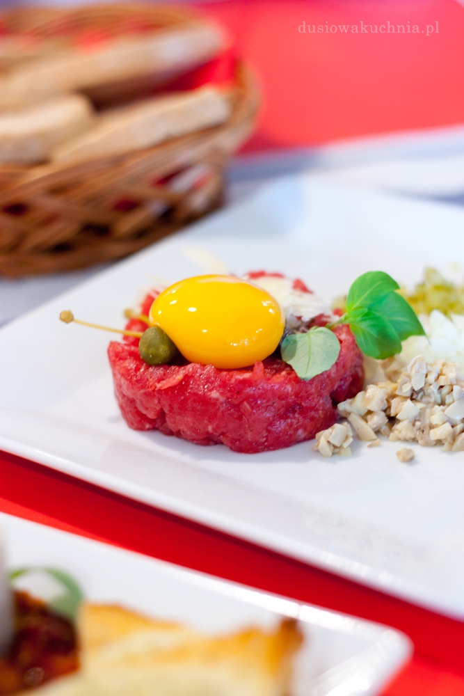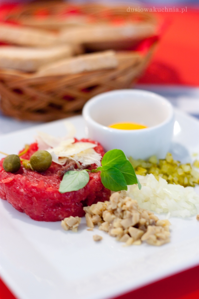 Z przystawek decydujemy się na tatar ( można poprosić o pieczywo i żółtko dodatkowo) oraz śledzika po kaszubsku ( po 8 zł). Cena niezwykle niska, jak na restauracje, ale dania naprawdę pyszne. Tatar dobrze posiekany podany z dodatkami, jakie lubimy: marynowane pieczarki, cebula, ogórki, kapary i parmezan. Mnie brakowało odrobiny oliwy do smaku, ale to kwestia gustu. Natomiast śledzik po kaszubsku pierwsza klasa, śledzie odpowiednio wymoczone, że nie były za słone, a dodatki idealne. Sama chciałabym umieć takiego śledzika przyrządzić :).