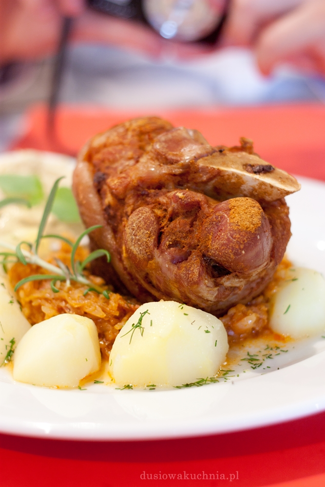 Pieczona golonka po kaszubsku została przygotowana rewelacyjnie, wyczuwalna była nuta papryki wśród przypraw, co było świetną odmianą. I choć to nie jest typ mięsa, które lubię to spróbowałam i naprawdę mi smakowało, brawa dla szefa kuchni. Mięso podano z zasmażaną kapustą i ziemniaczkami. Porcja naprawdę spora!