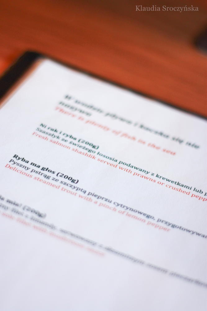 Menu okazało się zaskakujące…w nazwach. Każdy dział i każde dania ma zabawną nazwę, jednak faktycznie nawiązującą do potrawy, bardzo nam się to spodobało. W karcie dań znajdziemy takie działy jak: