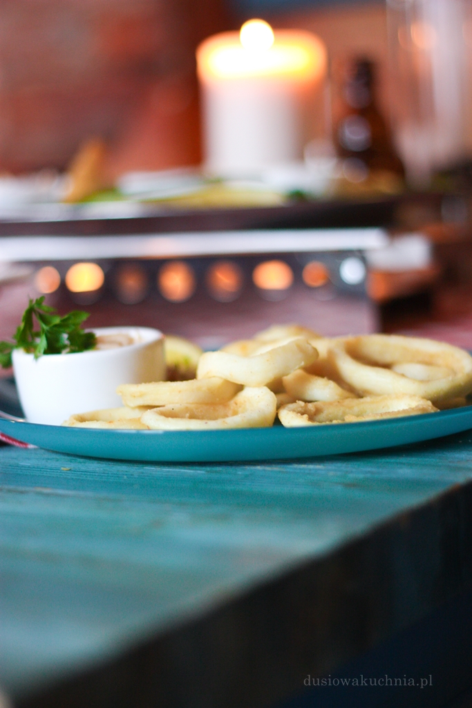 Kuchnia śródziemnomorska przepełniona jest owocami morzami, a więc na danie główne zamawiam smażone kalmary z sosem czosnkowym. Kalmary są świeże, delikatne i dobrze przyrządzone – zdecydowanie to w tej restauracji kalmary smakują mi najlepiej. W zestawie z krokietami ziemniaczanymi i warzywami grillowanymi kosztują 31,50 zł. Danie lekkie i przyjemne. W między czasie naszej kolacji ściemnia się i kelnerka od razu zapala nam świecę na stole.