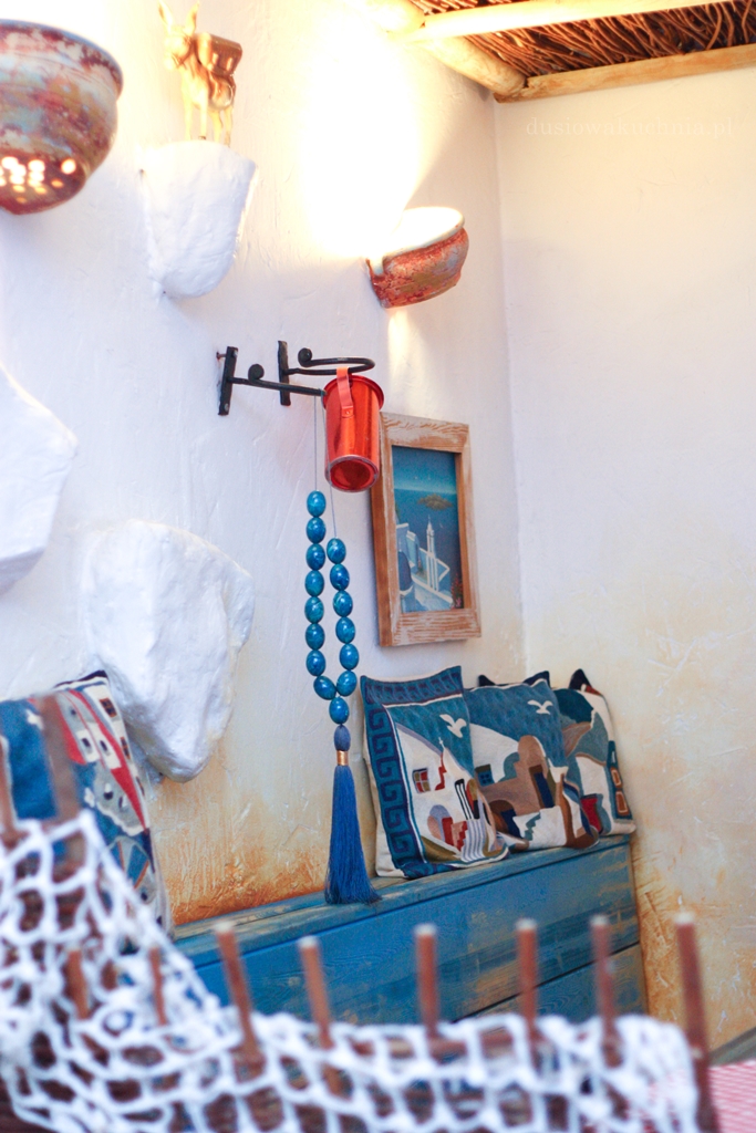 Restauracja Santorini znajduje się wewnątrz podwórza i aby do niej zajrzeć trzeba przejść przez ozdobioną w błękitnych kolorach bramę. Po przejściu naszym oczom ukazuje się zielony ogródek, który jest idealnym miejscem latem na kolację.