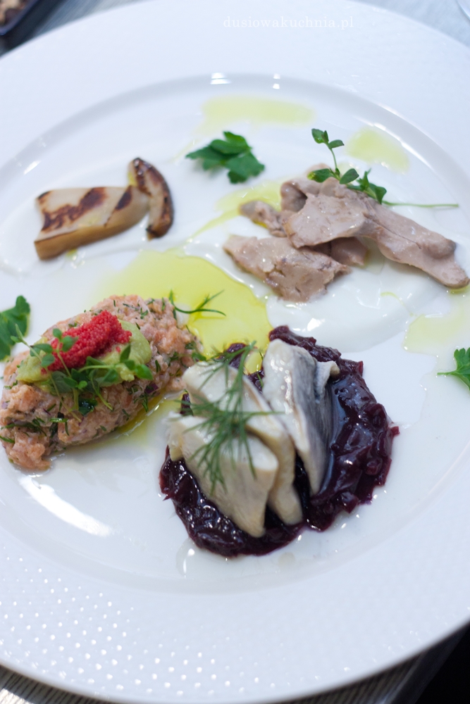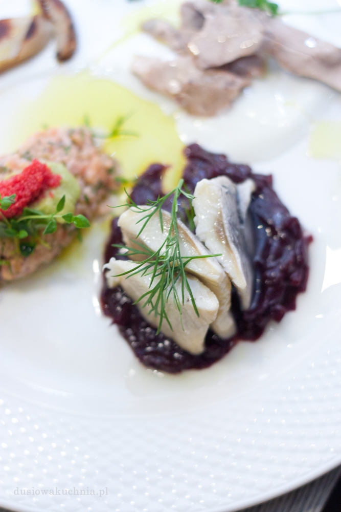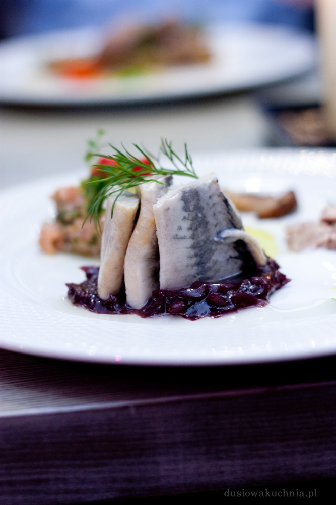 Na Kaszubach nie wypada pominąć śledzia, dlatego na drugą przystawkę wybraliśmy korzennego śledzia bałtyckiego, marynowaną wątróbkę z dorsza i tatar z łososia z musem awokado i kawiorem (26 zł). Uwielbiam błądzić po talerzu w poszukiwaniu wrażeń i tutaj właśnie tak było. Śledź był w najlepszym wydaniu, jakiego jadłam – podano go na pysznym chutneyu z cebuli i zaserwowano niczym króla na talerzu w pozycji pionowej. Tuż obok dumnie prezentował się pyszny tatar z łososia, który przyjemnie orzeźwił kubki smakowe. Zaskakująca była wątróbka z dorsza – rozpływała się w ustach, jestem przekonana, że można spróbować ją tylko w tej restauracji.