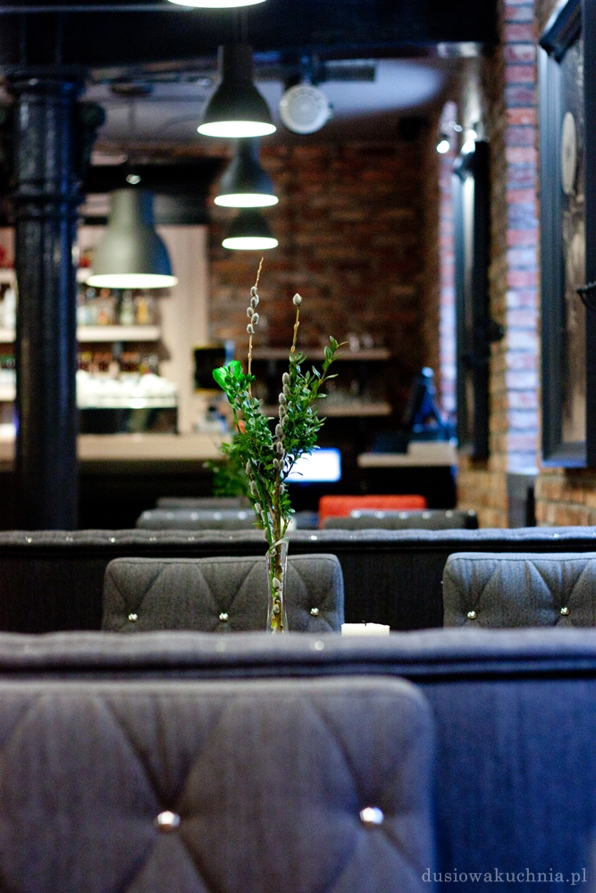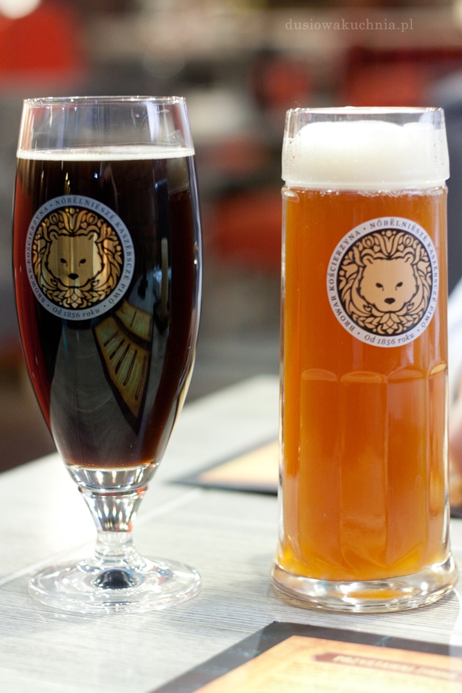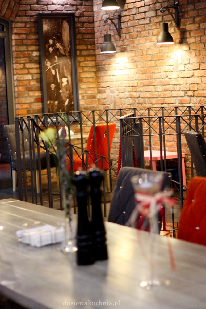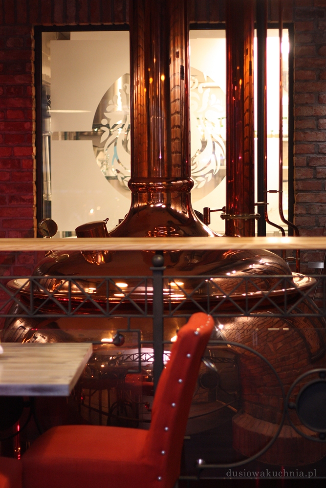 Restauracja jest niezwykle spójna z wyglądem całego hotelu – tu również postanowiono połączyć to, co historyczne z tym, co nowoczesne. Ściany z czerwonej cegły i historyczne zdjęcia na nich stwarzają niesamowity klimat w połączeniu z czerwonymi i szarymi okuciami na fotelach i krzesłach. Industrialne wnętrza chyba zawsze będą robić na mnie wrażenia. Wielkie miedziane kadzie z warzonym na miejscu piwem przykuwają oko i zdecydowanie zachęcają do spróbowania Kościerskiego Piwa.