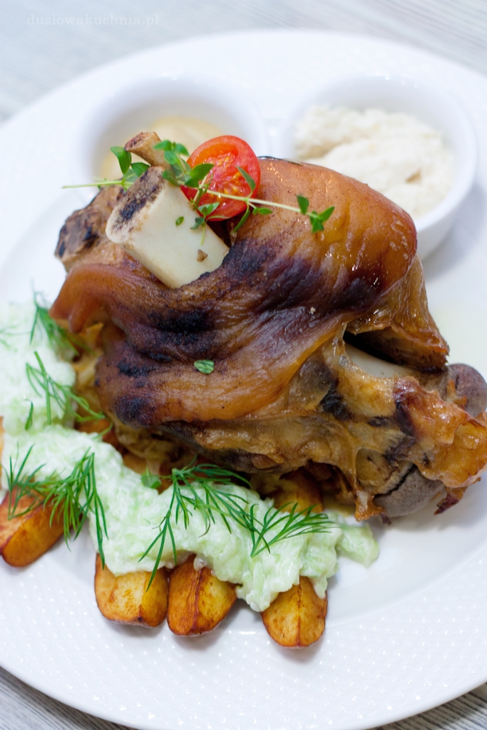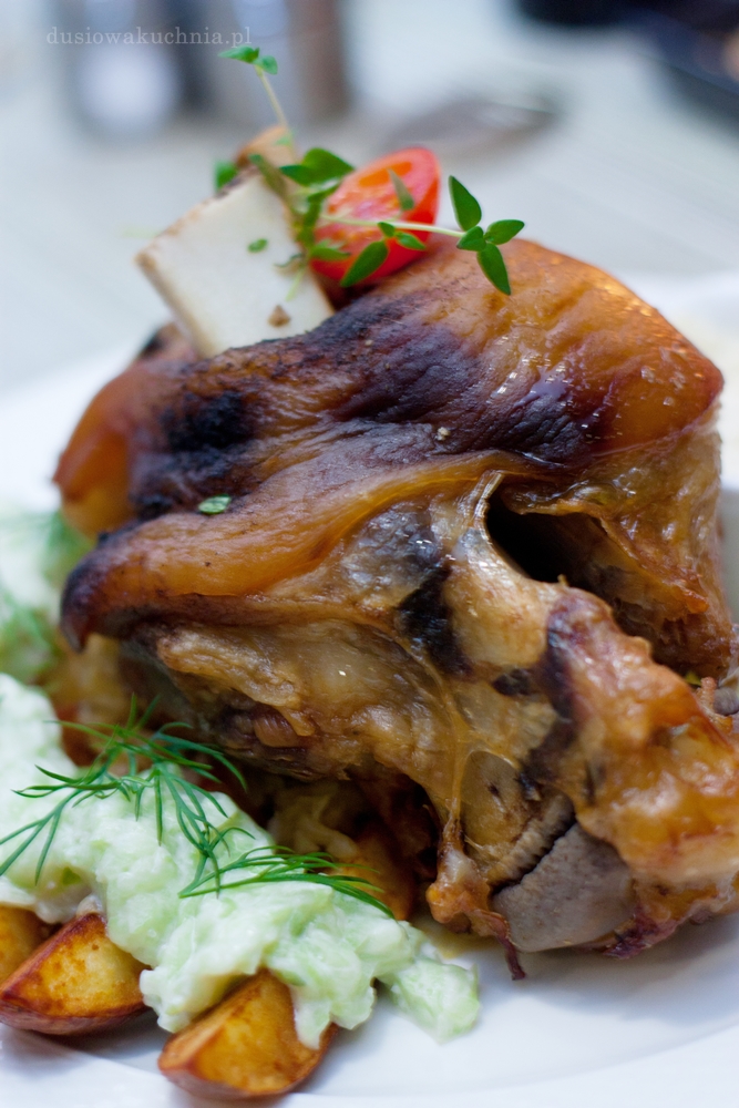 Wśród dań głównych królują propozycje mięsne, a Paweł, jako prawdziwy mężczyzna skusił się na golonkę browarnika na zasmażanej kapuście z pieczonymi ziemniakami i dipem ogórkowo-czosnkowym (34 zł). Porcja przerosła nawet Jego oczekiwania :). To była golonka olbrzym, niezwykle wybornie przyrządzona, odpowiednio przyprawiona, pyszna. Porcja na wielki głód :). Istna kulinarna rozpusta.