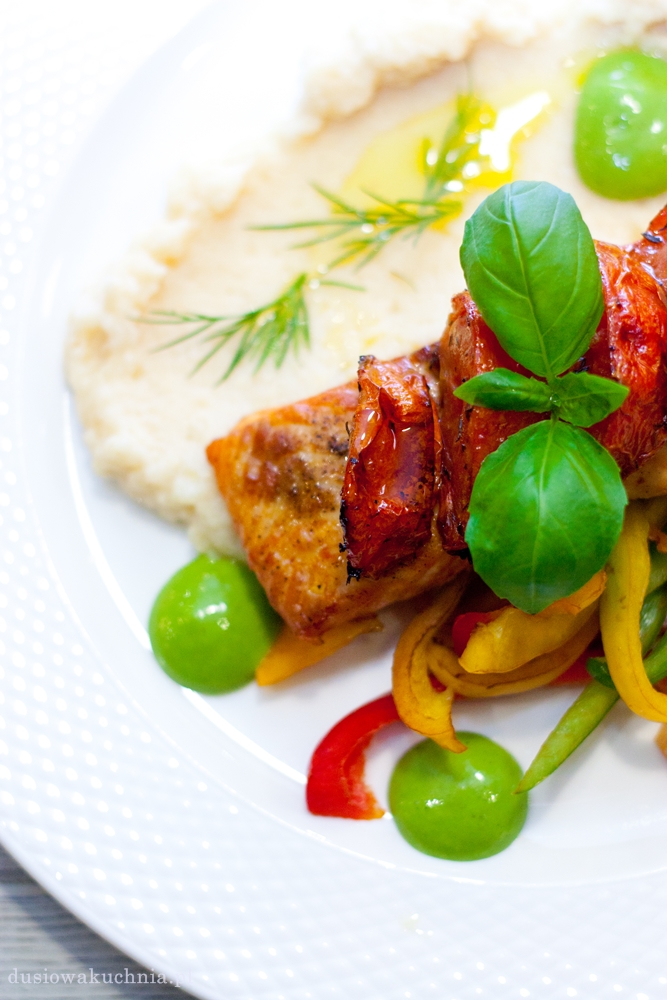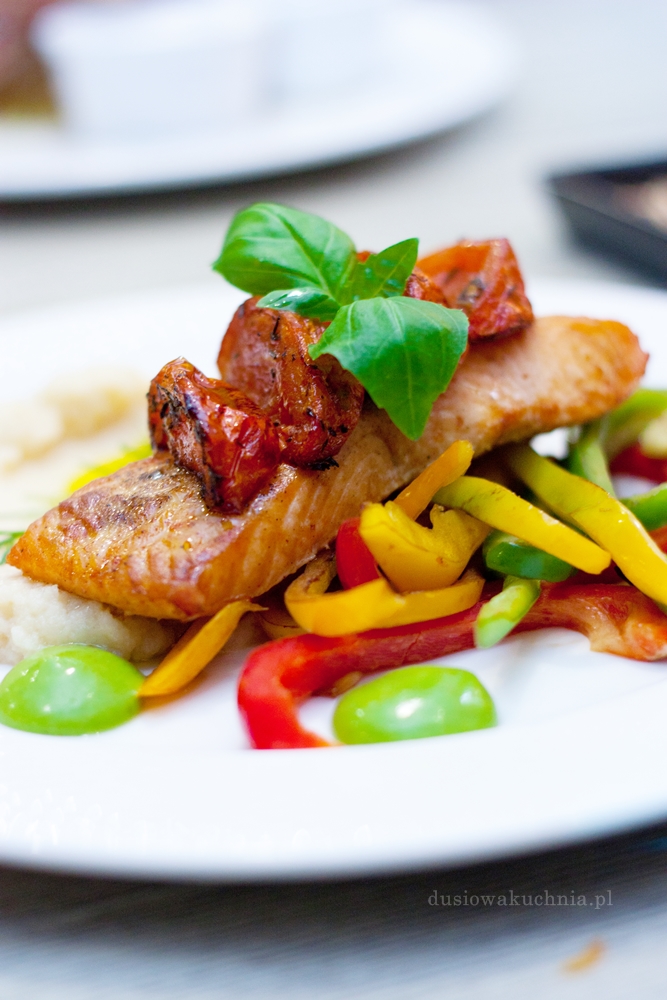 Propozycje mięsne z kuchni polskiej zdecydowanie nie są dla mnie, dlatego ucieszyłam się z możliwości wyboru dań rybnych. Kusił mnie dorsz zapiekany z masłem śliwkowo-rozmarynowym, ale w końcu zdecydowałam się na pieczonego łososia, pomidory confit, puree z selera, paprykę flambirowaną w occie balsamico, dressing z rukoli (42 zł). To był strzał w dziesiątkę, danie zostało wprost stworzone dla mnie, było tak idealne w smaku i wyglądzie, że na samą myśl o nim działają mi ślinianki :).