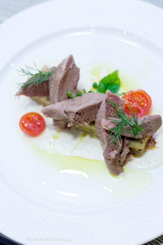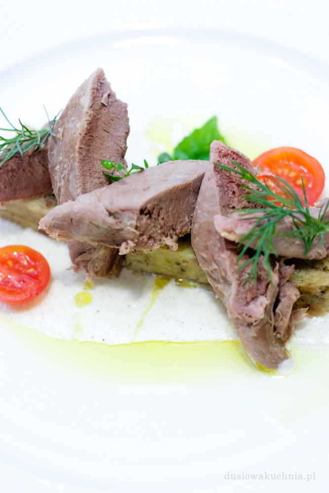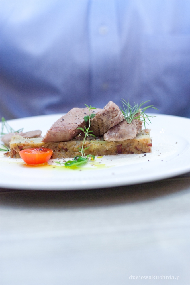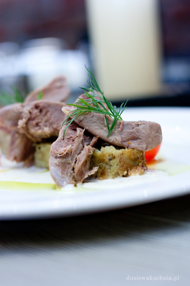 Wśród przystawek do wyboru są dwie propozycje na zimno i dwie na ciepło. Zdecydowaliśmy się na gotowane ozory wieprzowe z grucholcem, czyli babką ziemniaczaną i sosem chrzanowym za 23 zł. Ozorki to najbardziej wartościowe podroby, ale też jedne z trudniejszych do przygotowania – trzeba wiedzieć, co i jak – te, które nam podano były naprawdę bardzo dobre, miękkie i delikatne. Przystawka okazała się całkiem sporej wielkości, zaserwowano ją w estetyczny sposób. Babka ziemniaczana była rewelacyjna, pełna kawałków boczku. Sos chrzanowy idealnie podkręcił smak całego dania.