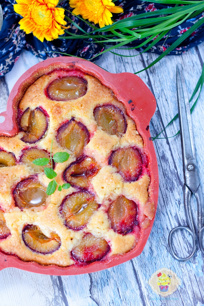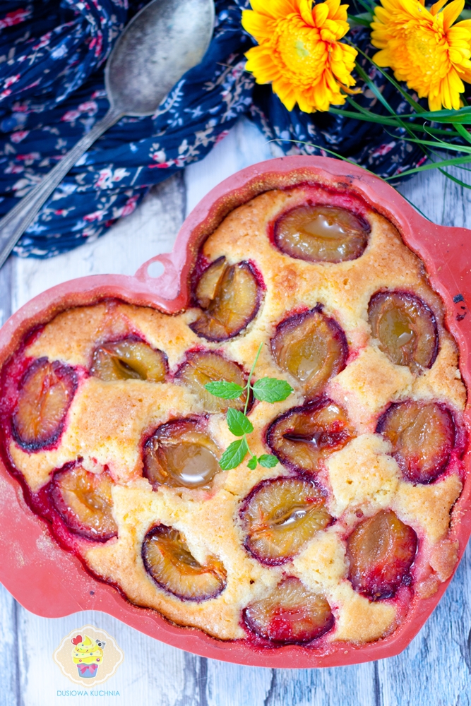 Przelać ciasto do foremki ( średnica 20-23 cm) wyłożonej papierem do pieczenia, a na wierzchu ułożyć połówki śliwek skórką do dołu.