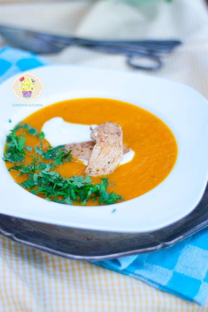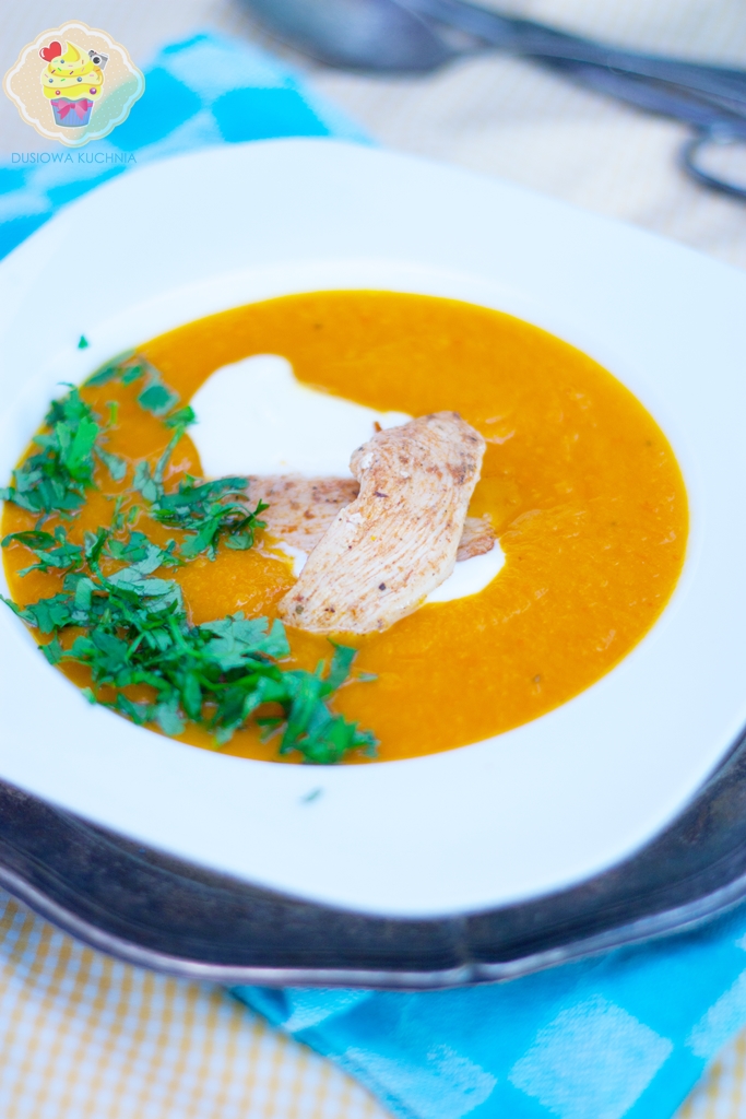 Zupa krem z dyni i marchewki z kurczakiem i kolendrą